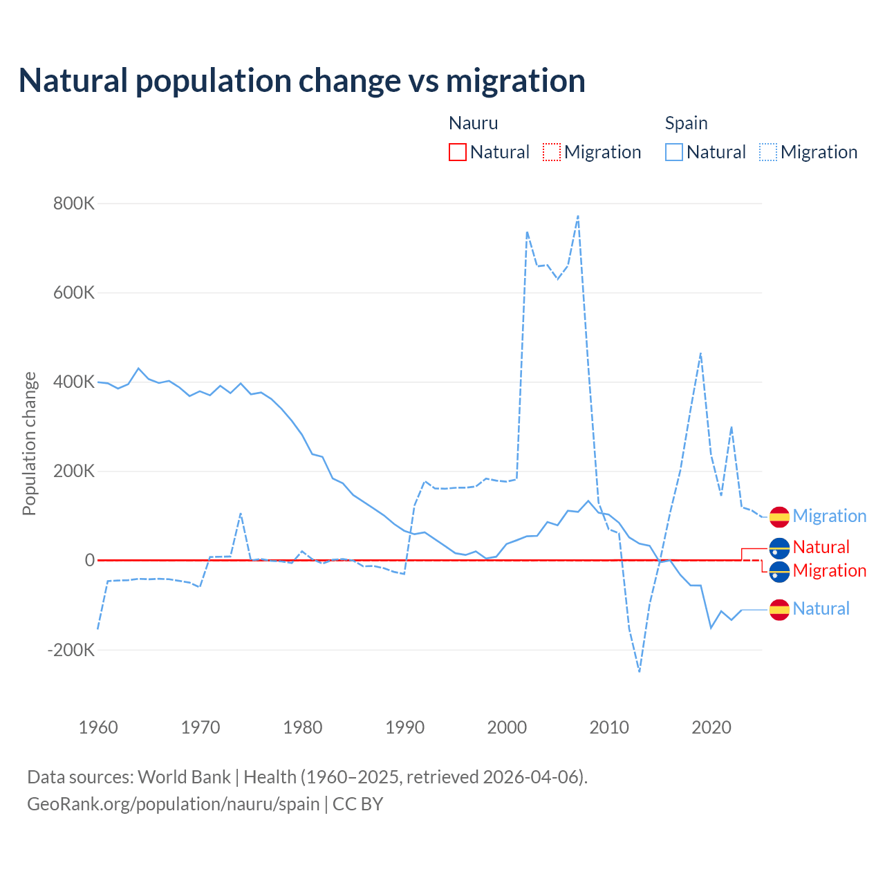Over the last 10 years, 66.2% of the population change in Nauru is from natural causes (a gain of 2,590 people) and 33.8% is from migration (a loss of 1,320 people). In Spain 25.8% is from natural causes (a loss of 627,829 people) and 74.2% is from migration (a gain of 1,810,127 people).