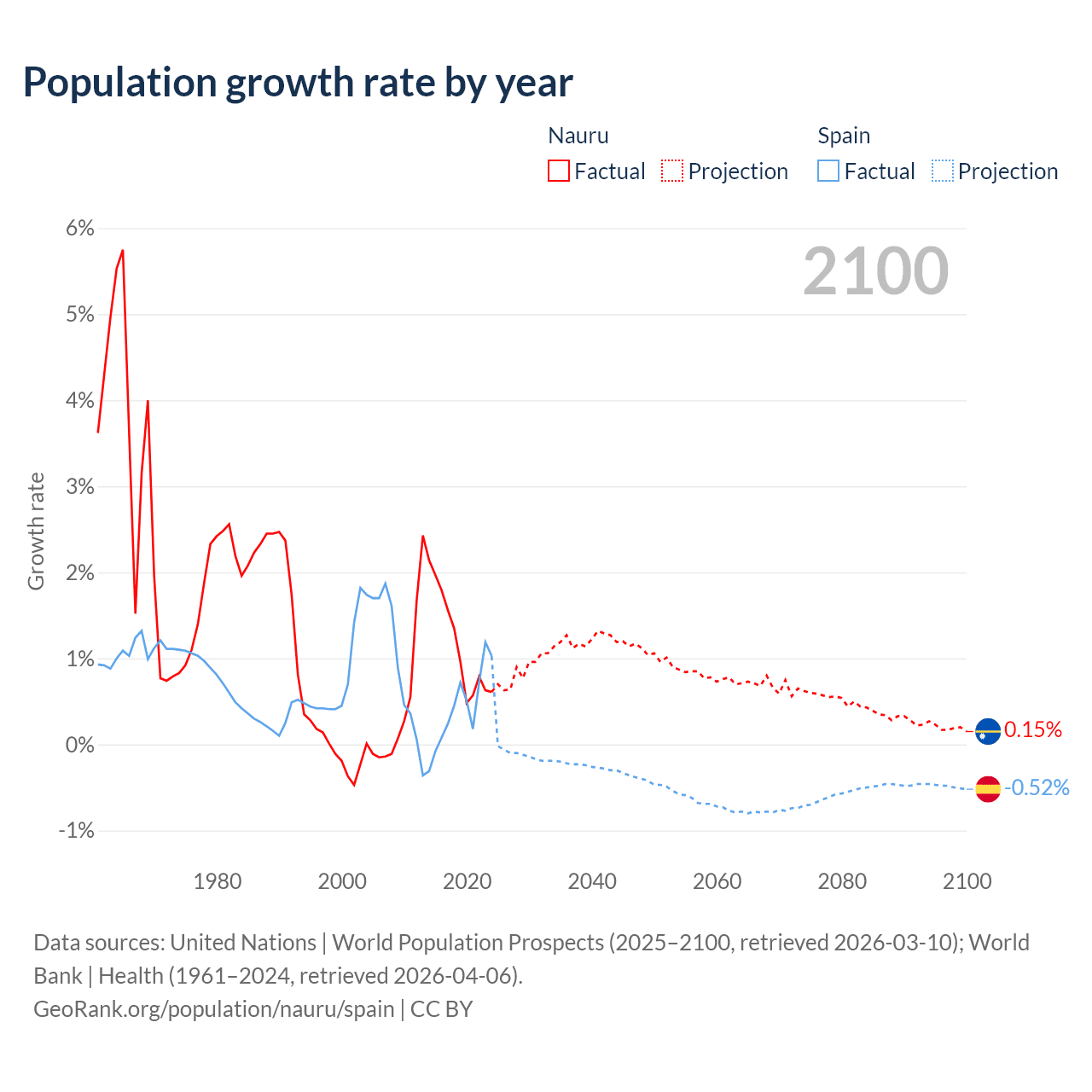 - For the last 10 years, Nauru has had an average growth rate of +1.17% per year vs +0.43% in Spain.