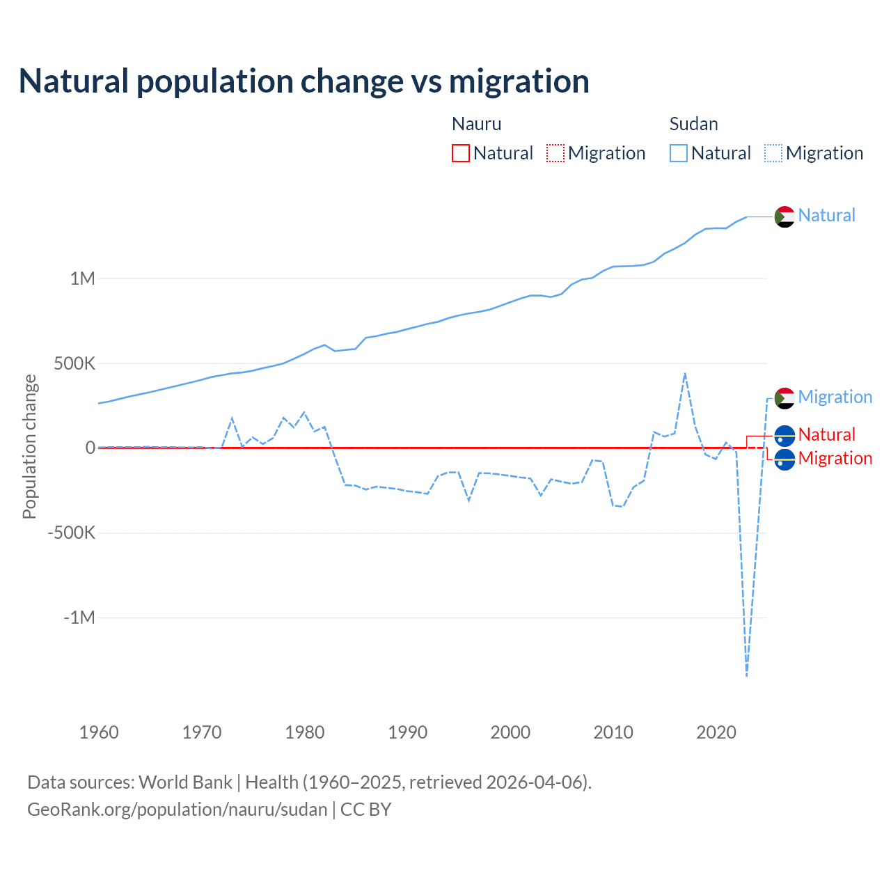 Over the last 10 years, 66.2% of the population change in Nauru is from natural causes (a gain of 2,590 people) and 33.8% is from migration (a loss of 1,320 people). In Sudan 95.1% is from natural causes (a gain of 12,459,977 people) and 4.88% is from migration (a loss of 639,596 people).