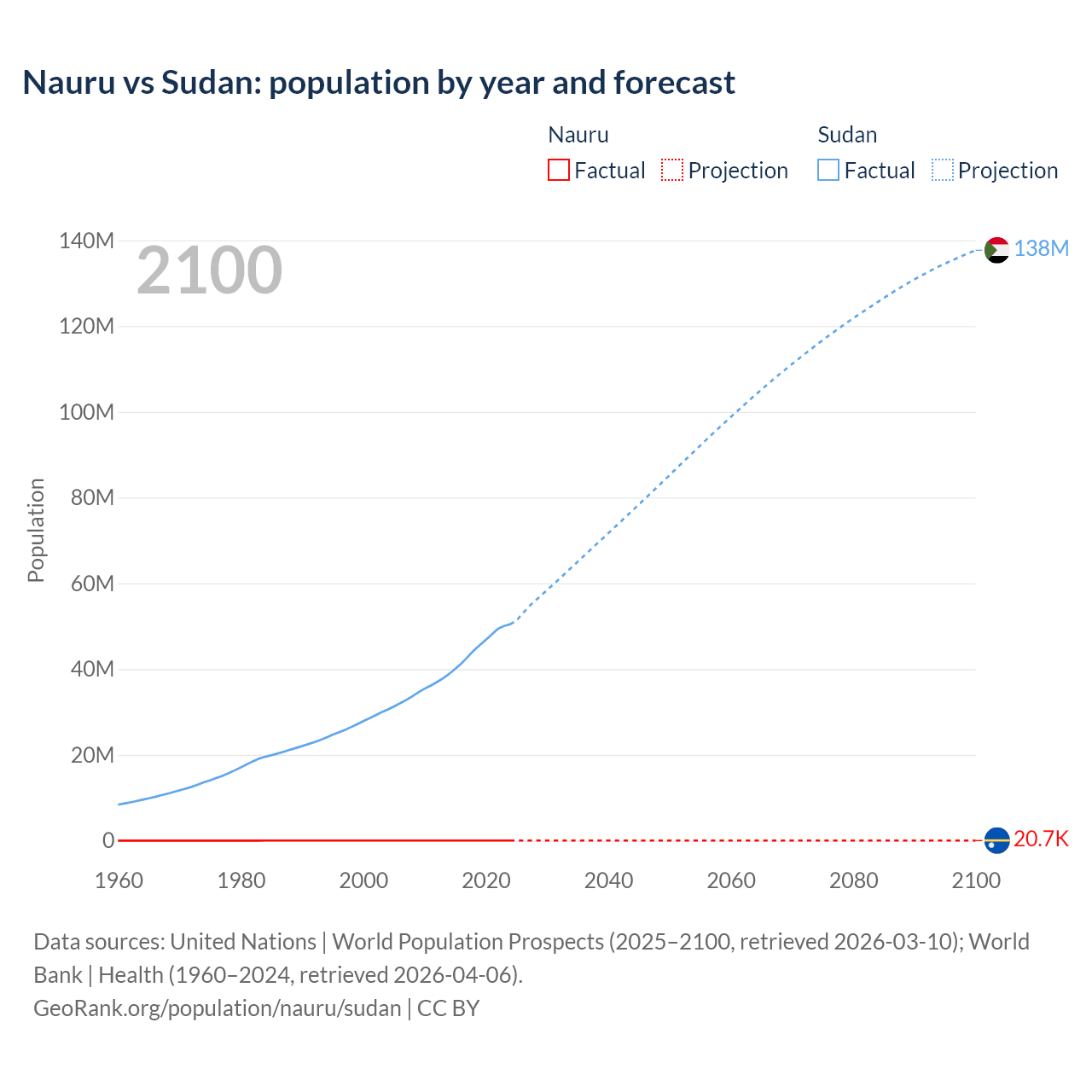 The latest officially reported population of Nauru was 11,947 in 2024 vs 50,448,963 people in Sudan in 2024. In 2026, based on the adjusted UN estimation, the current Nauru's population is 12,125 people compared to 53,335,233 in Sudan.