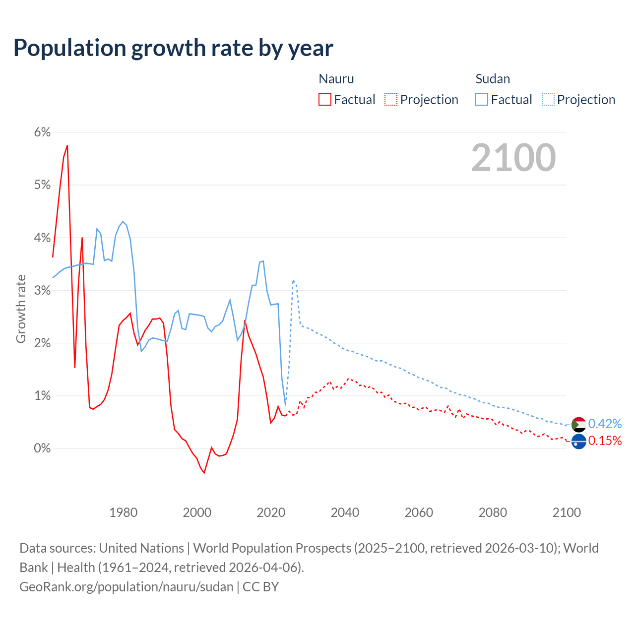 - For the last 10 years, Nauru has had an average growth rate of +1.17% per year vs +2.67% in Sudan.