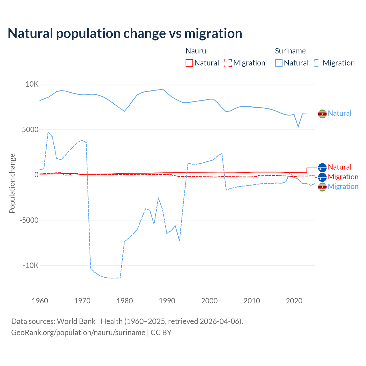 Over the last 10 years, 66.2% of the population change in Nauru is from natural causes (a gain of 2,590 people) and 33.8% is from migration (a loss of 1,320 people). In Suriname 90.3% is from natural causes (a gain of 66,709 people) and 9.72% is from migration (a loss of 7,185 people).