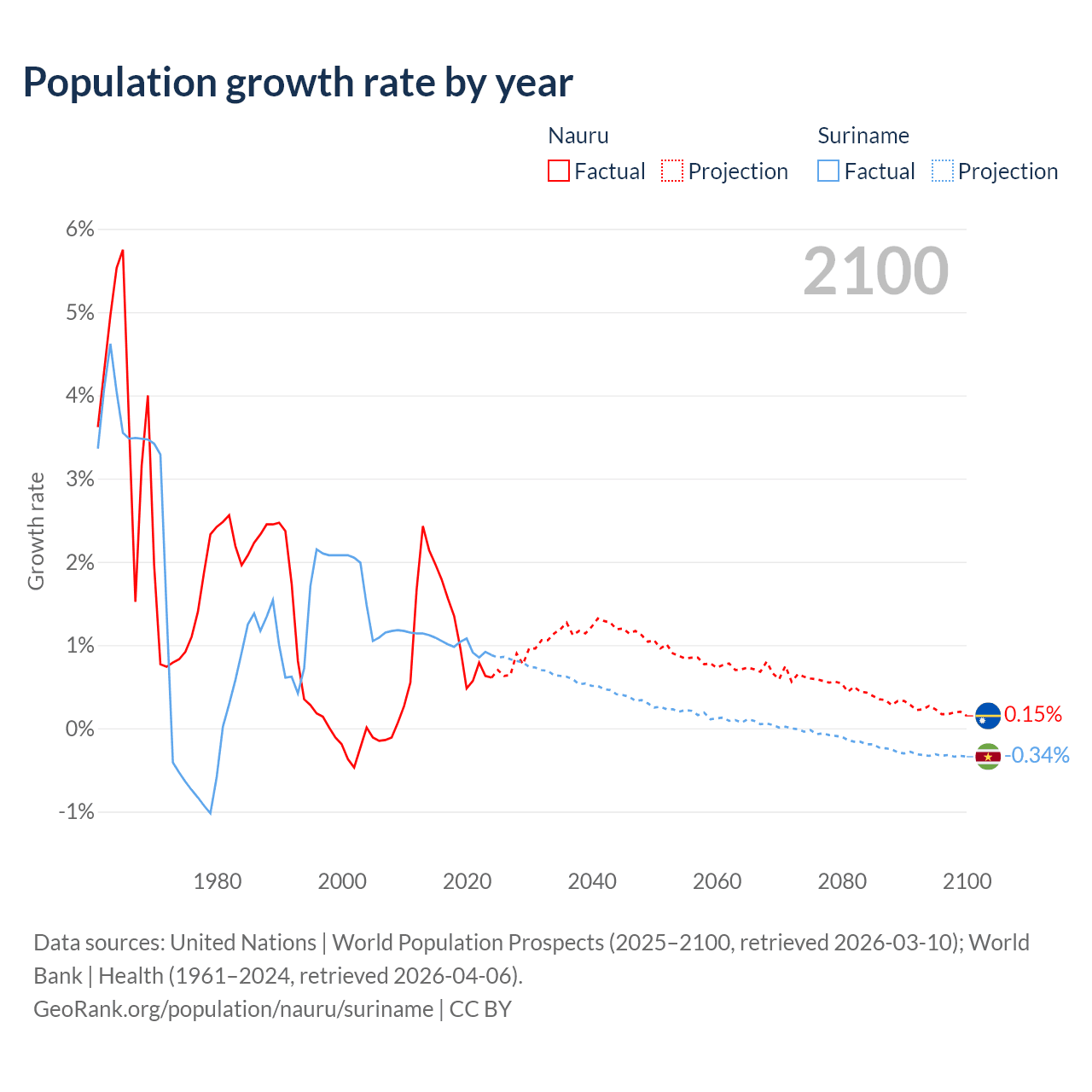 - For the last 10 years, Nauru has had an average growth rate of +1.17% per year vs +0.99% in Suriname.
