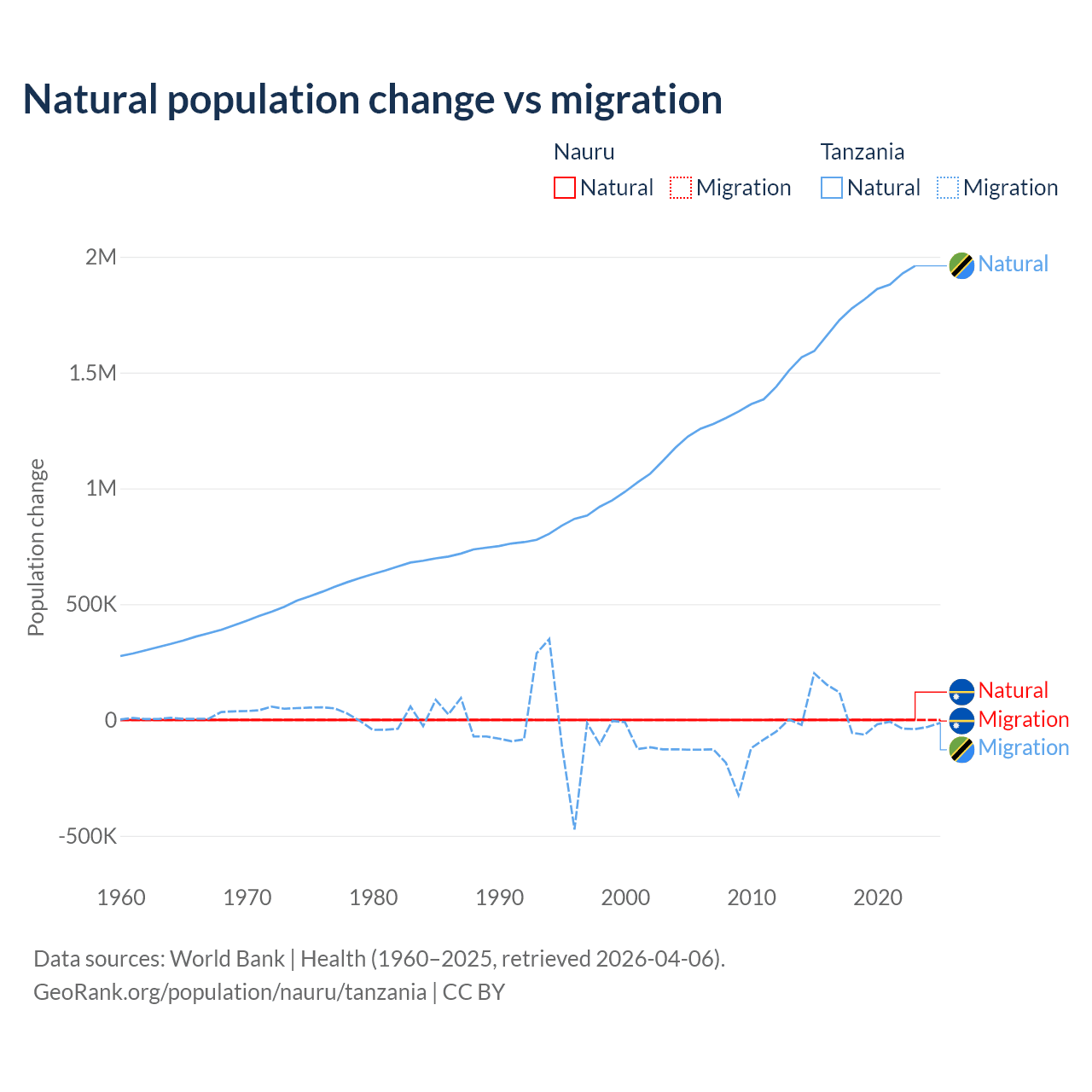 Over the last 10 years, 66.2% of the population change in Nauru is from natural causes (a gain of 2,590 people) and 33.8% is from migration (a loss of 1,320 people). In Tanzania 98.7% is from natural causes (a gain of 17,769,541 people) and 1.27% is from migration (a gain of 229,466 people).