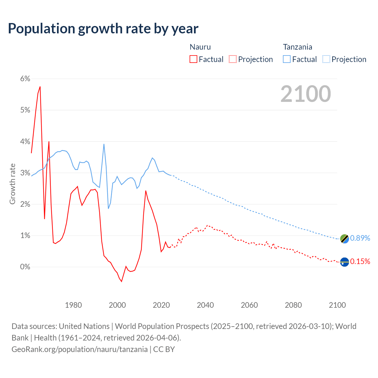 - For the last 10 years, Nauru has had an average growth rate of +1.17% per year vs +3.13% in Tanzania.