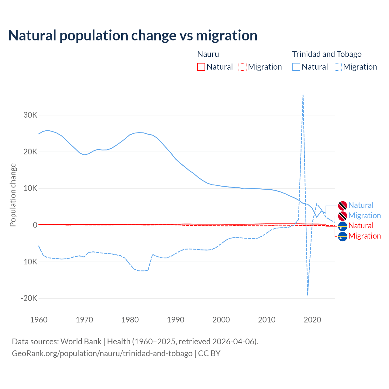 Over the last 10 years, 66.2% of the population change in Nauru is from natural causes (a gain of 2,590 people) and 33.8% is from migration (a loss of 1,320 people). In Trinidad and Tobago 66% is from natural causes (a gain of 55,887 people) and 34% is from migration (a gain of 28,785 people).