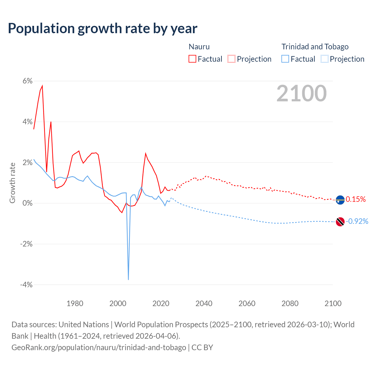 - For the last 10 years, Nauru has had an average growth rate of +1.17% per year vs +0.19% in Trinidad and Tobago.