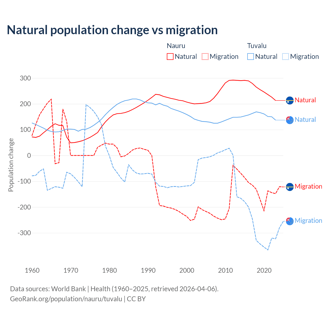 Over the last 10 years, 66.2% of the population change in Nauru is from natural causes (a gain of 2,590 people) and 33.8% is from migration (a loss of 1,320 people). In Tuvalu 35.5% is from natural causes (a gain of 1,556 people) and 64.5% is from migration (a loss of 2,827 people).