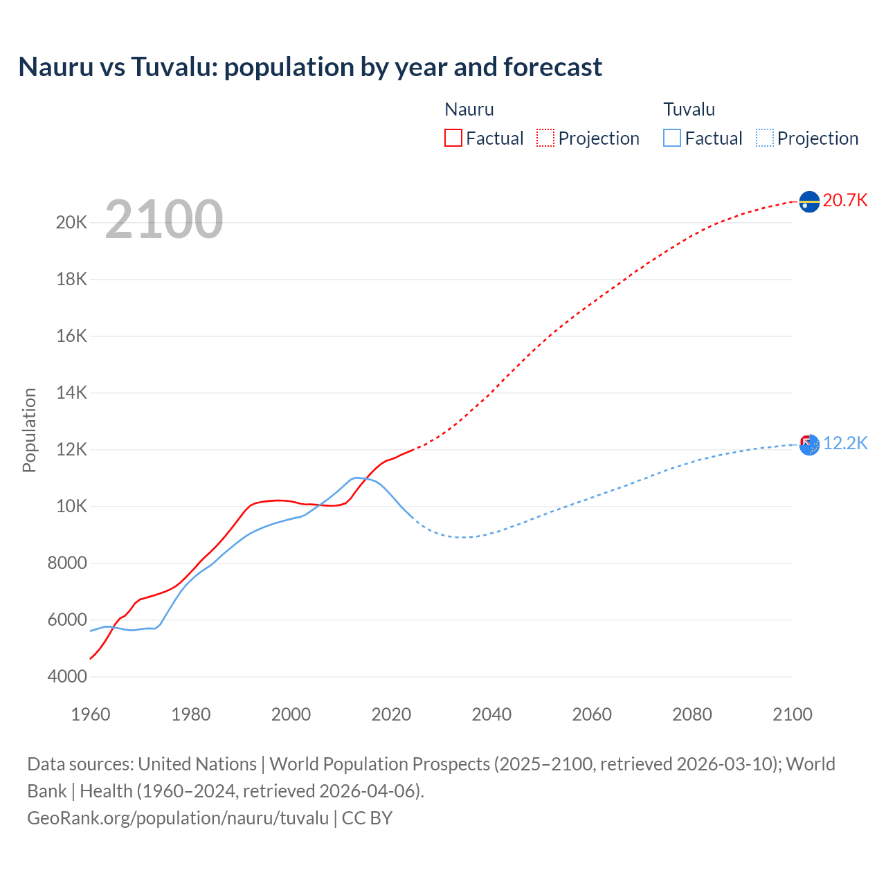 The latest officially reported population of Nauru was 11,947 in 2024 vs 9,646 people in Tuvalu in 2024. In 2026, based on the adjusted UN estimation, the current Nauru's population is 12,125 people compared to 9,341 in Tuvalu.