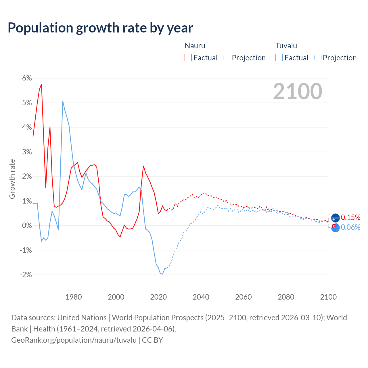 - For the last 10 years, Nauru has had an average growth rate of +1.17% per year vs -1.19% in Tuvalu.