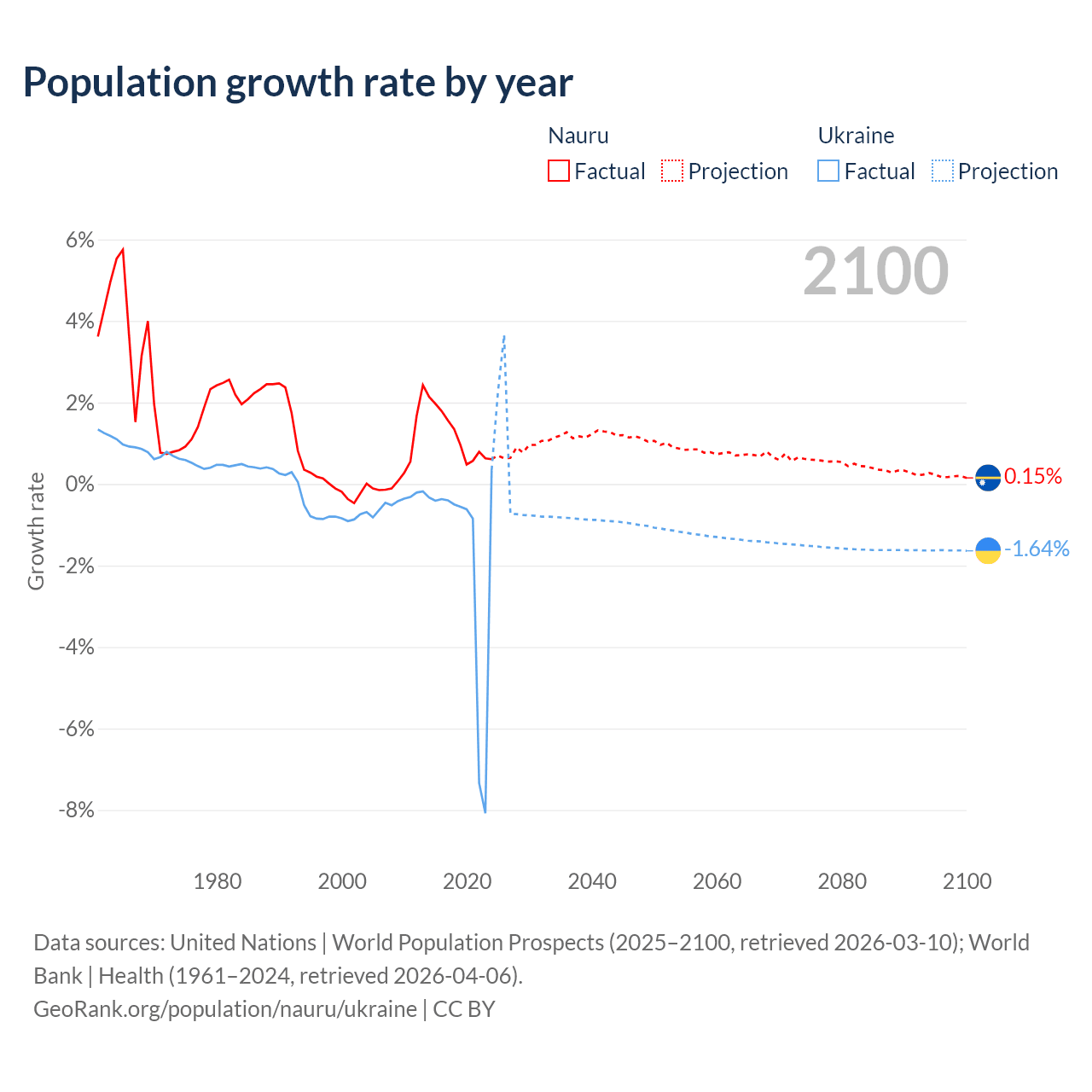 - For the last 10 years, Nauru has had an average growth rate of +1.17% per year vs -1.74% in Ukraine.