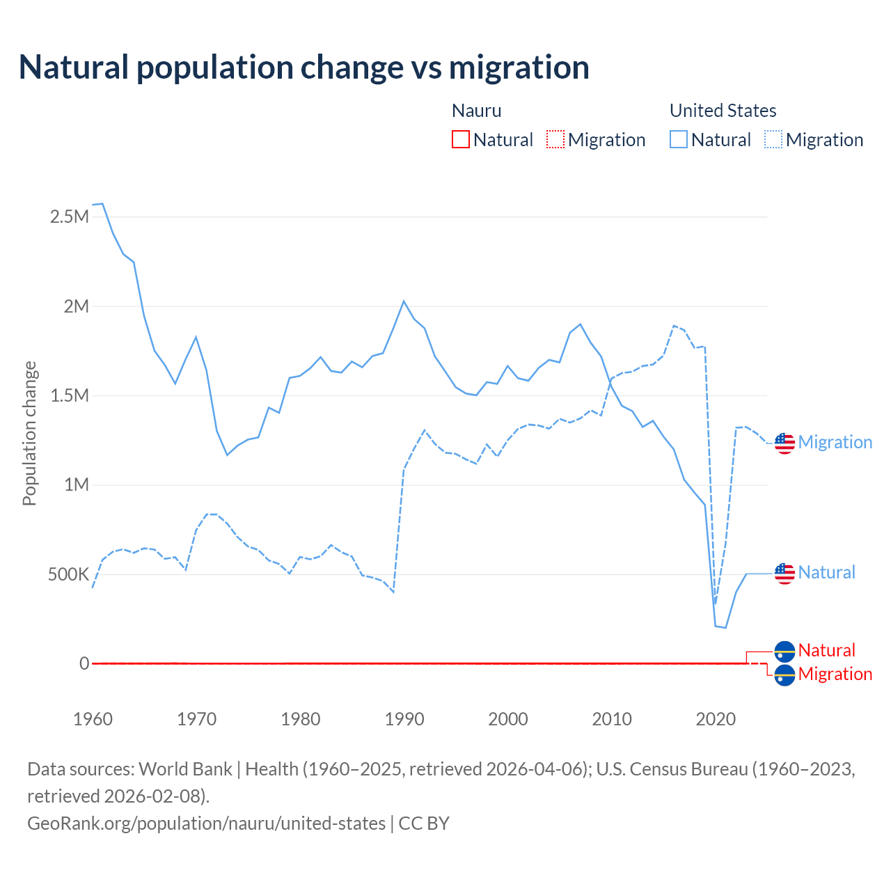 Over the last 10 years, 66.2% of the population change in Nauru is from natural causes (a gain of 2,590 people) and 33.8% is from migration (a loss of 1,320 people). In the United States 35.8% is from natural causes (a gain of 8,005,866 people) and 64.2% is from migration (a gain of 14,334,286 people).
