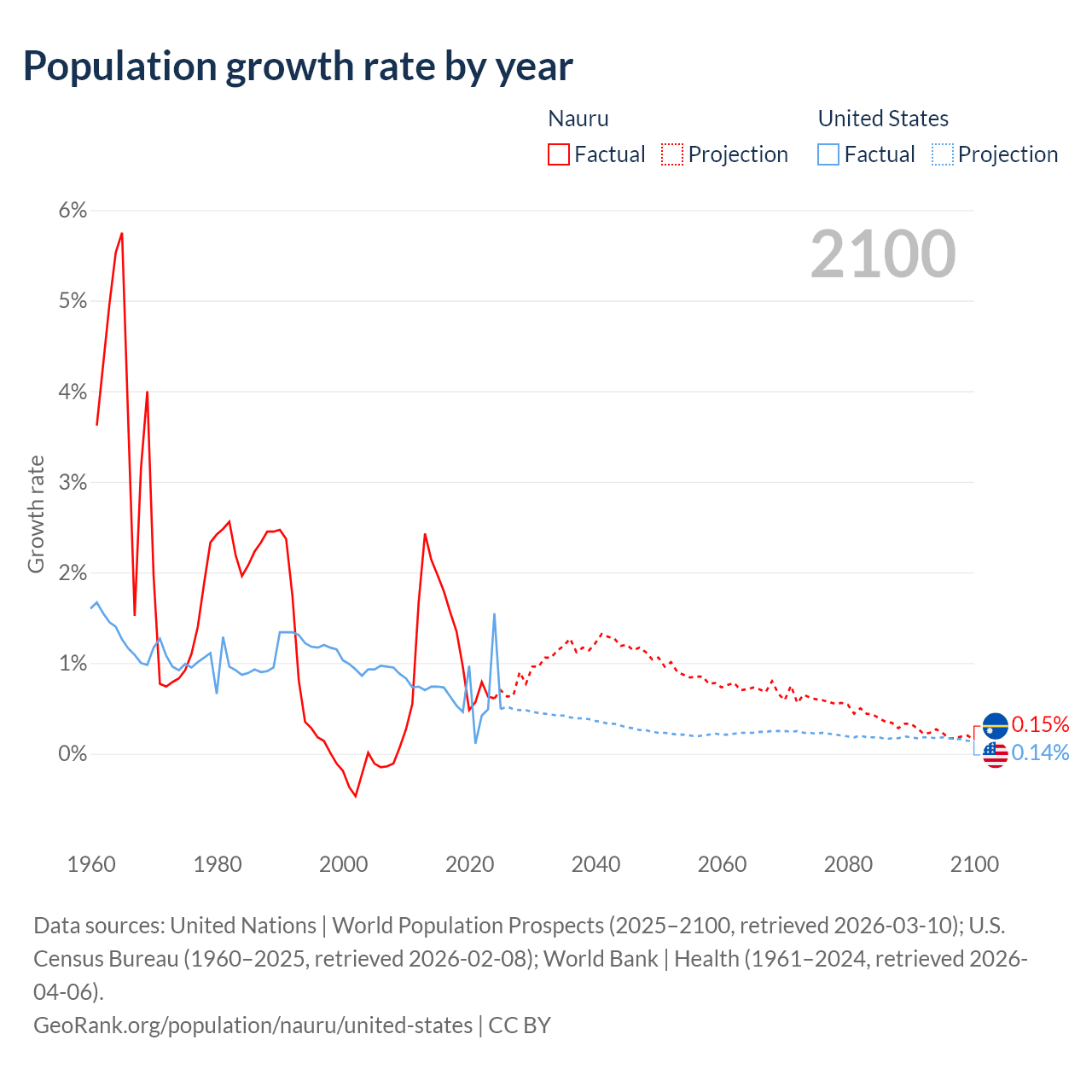 - For the last 10 years, Nauru has had an average growth rate of +1.17% per year vs +0.65% in the United States.