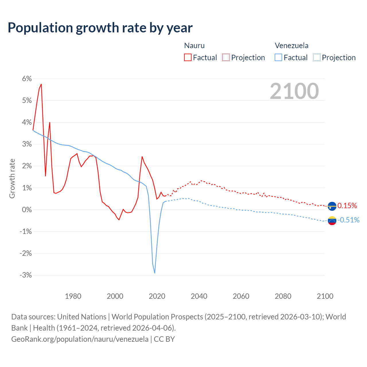 - For the last 10 years, Nauru has had an average growth rate of +1.17% per year vs -0.46% in Venezuela.