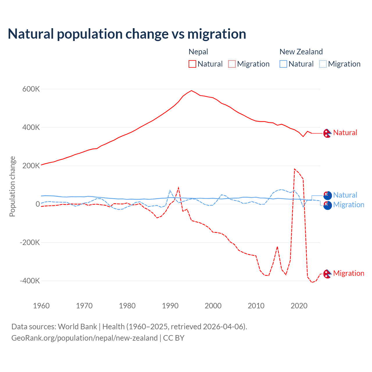 Over the last 10 years, 67.9% of the population change in Nepal is from natural causes (a gain of 3,909,749 people) and 32.1% is from migration (a loss of 1,851,664 people). In New Zealand 34.4% is from natural causes (a gain of 247,767 people) and 65.6% is from migration (a gain of 471,602 people).