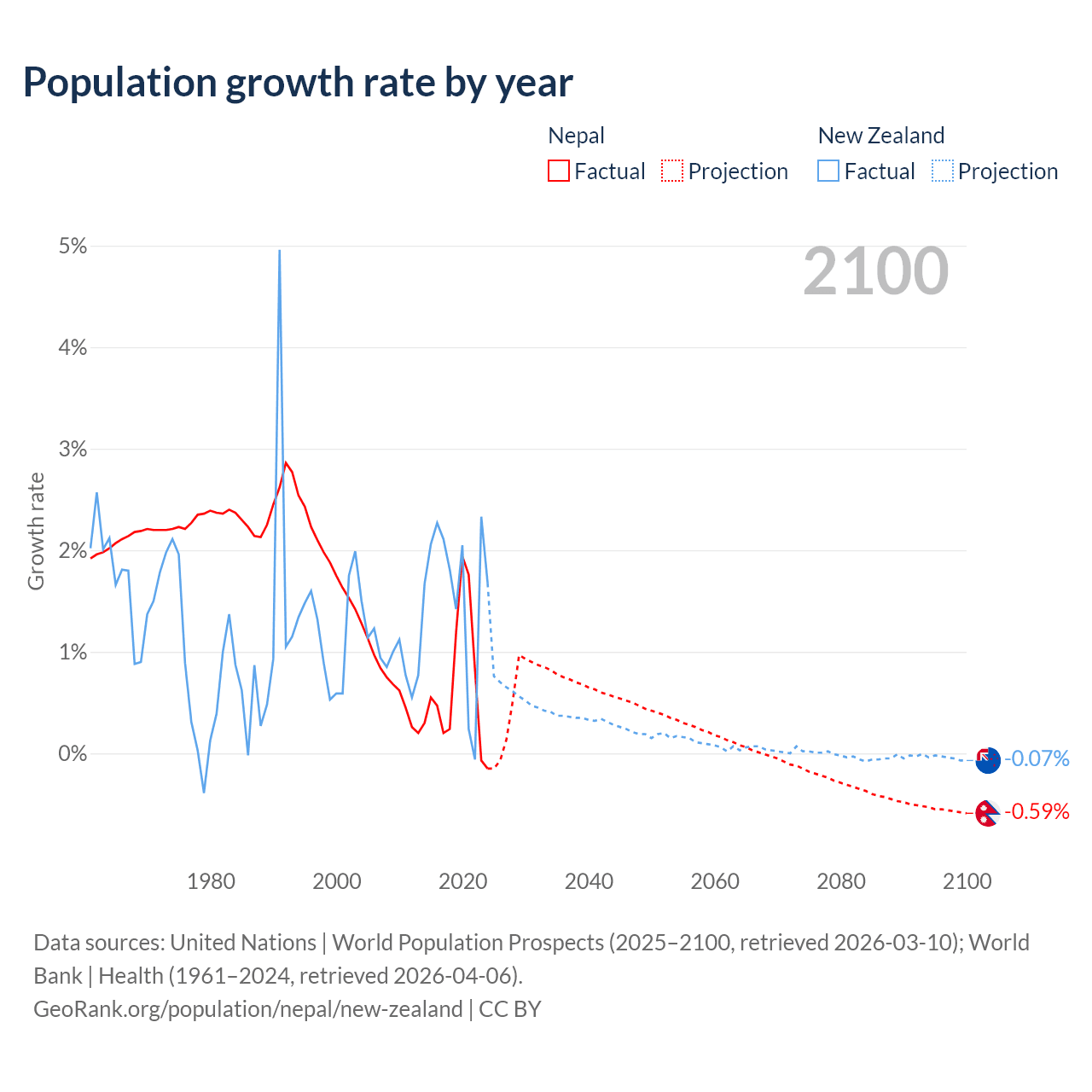 - For the last 10 years, Nepal has had an average growth rate of +0.66% per year vs +1.6% in New Zealand.