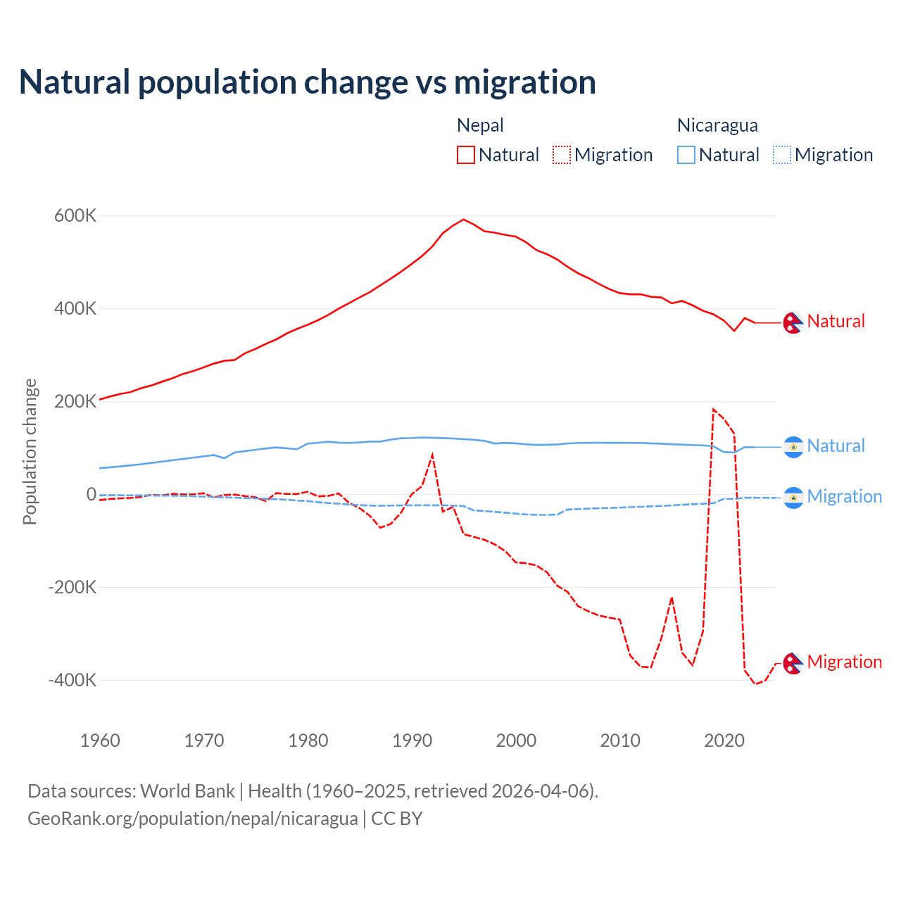 Over the last 10 years, 67.9% of the population change in Nepal is from natural causes (a gain of 3,909,749 people) and 32.1% is from migration (a loss of 1,851,664 people). In Nicaragua 85.5% is from natural causes (a gain of 1,017,084 people) and 14.5% is from migration (a loss of 172,078 people).