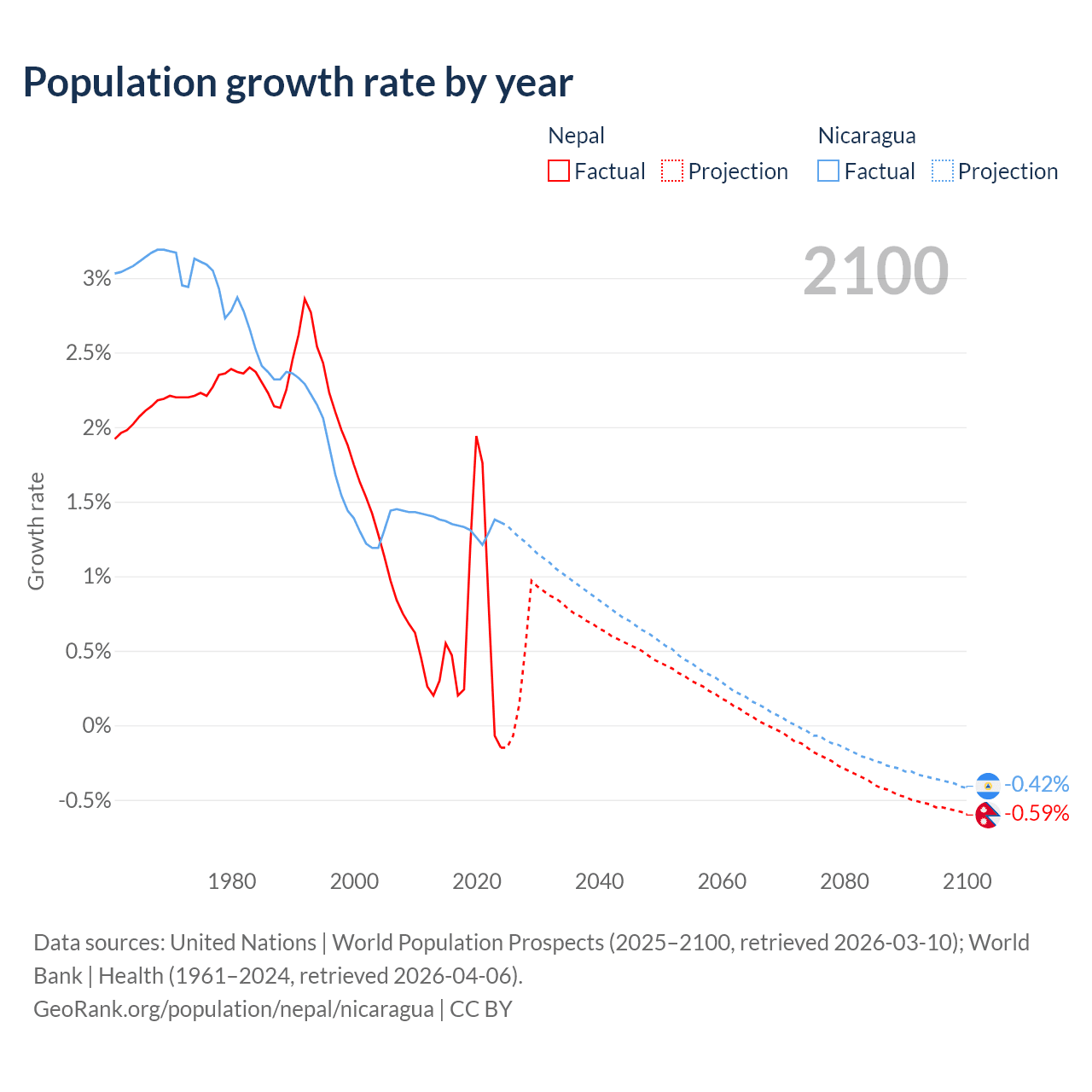 - For the last 10 years, Nepal has had an average growth rate of +0.66% per year vs +1.33% in Nicaragua.