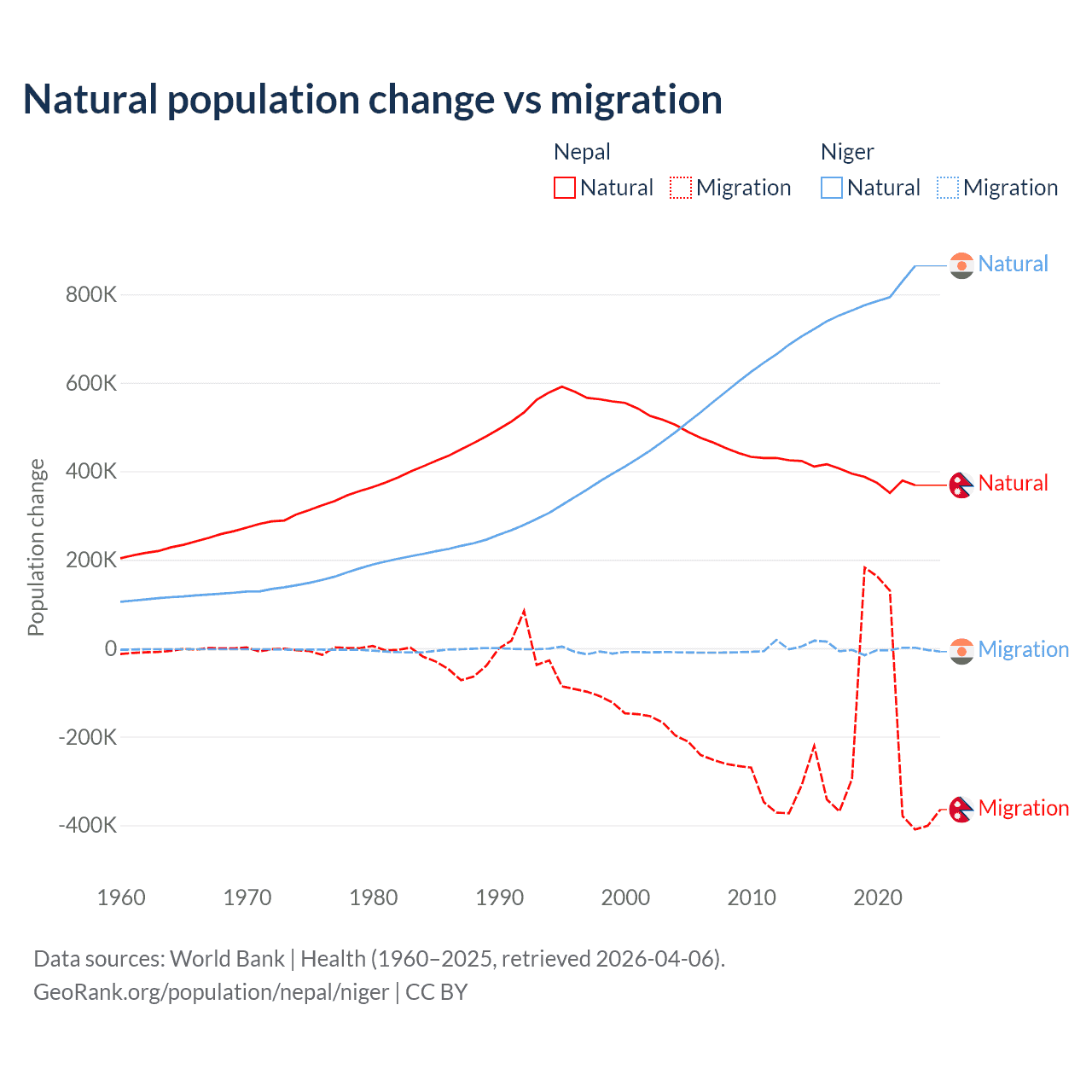 Over the last 10 years, 67.9% of the population change in Nepal is from natural causes (a gain of 3,909,749 people) and 32.1% is from migration (a loss of 1,851,664 people). In Niger 100% is from natural causes (a gain of 7,728,287 people) and 0.03% is from migration (a gain of 2,520 people).
