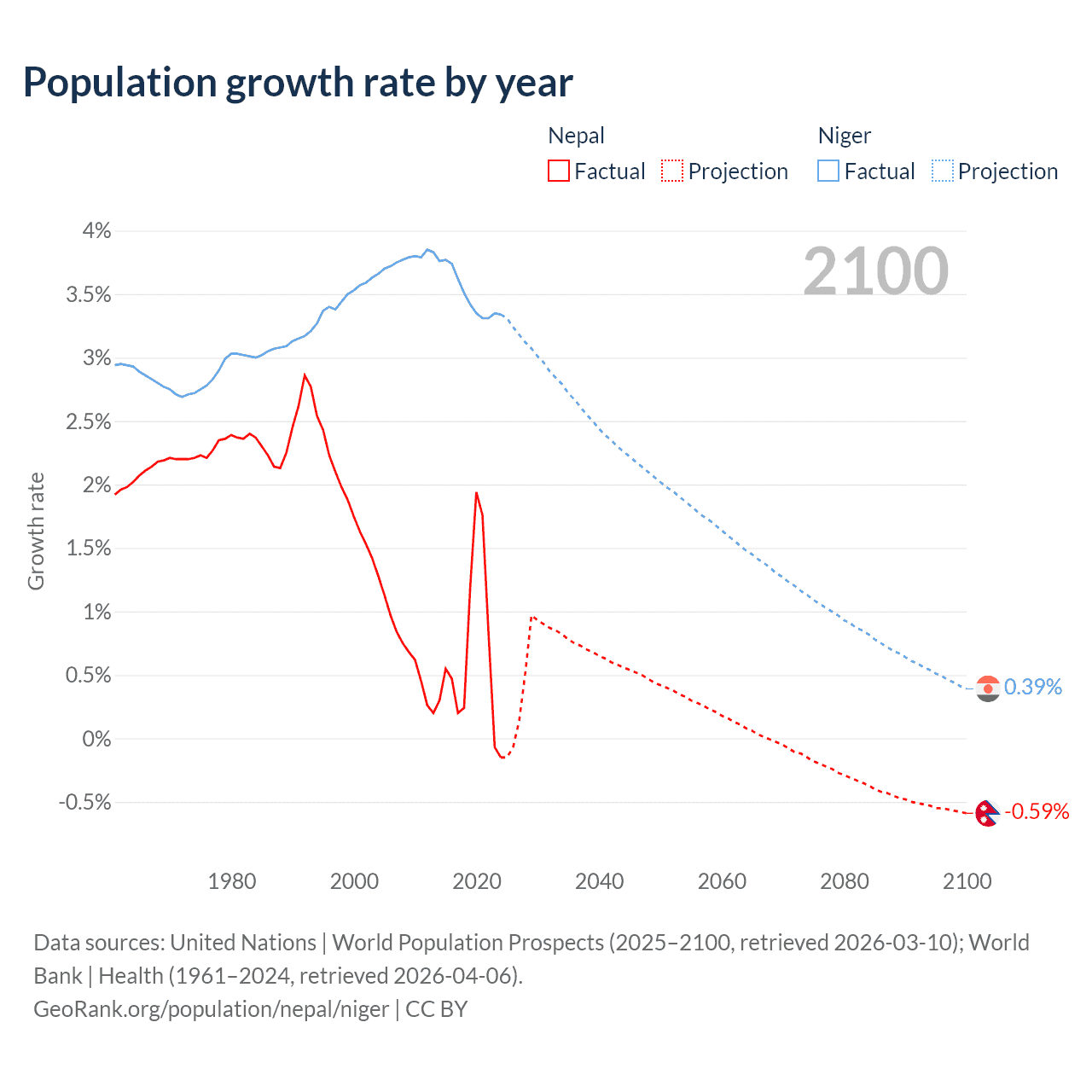 - For the last 10 years, Nepal has had an average growth rate of +0.66% per year vs +3.5% in Niger.