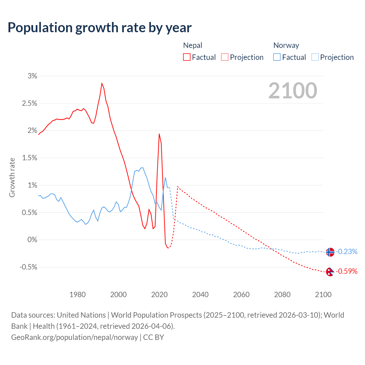 - For the last 10 years, Nepal has had an average growth rate of +0.66% per year vs +0.85% in Norway.