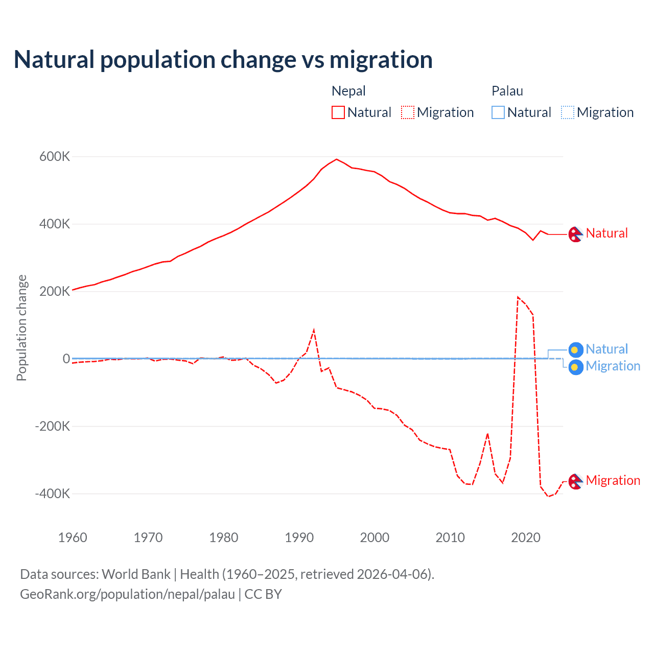 Over the last 10 years, 67.9% of the population change in Nepal is from natural causes (a gain of 3,909,749 people) and 32.1% is from migration (a loss of 1,851,664 people). In Palau 53.8% is from natural causes (a gain of 264 people) and 46.2% is from migration (a loss of 227 people).