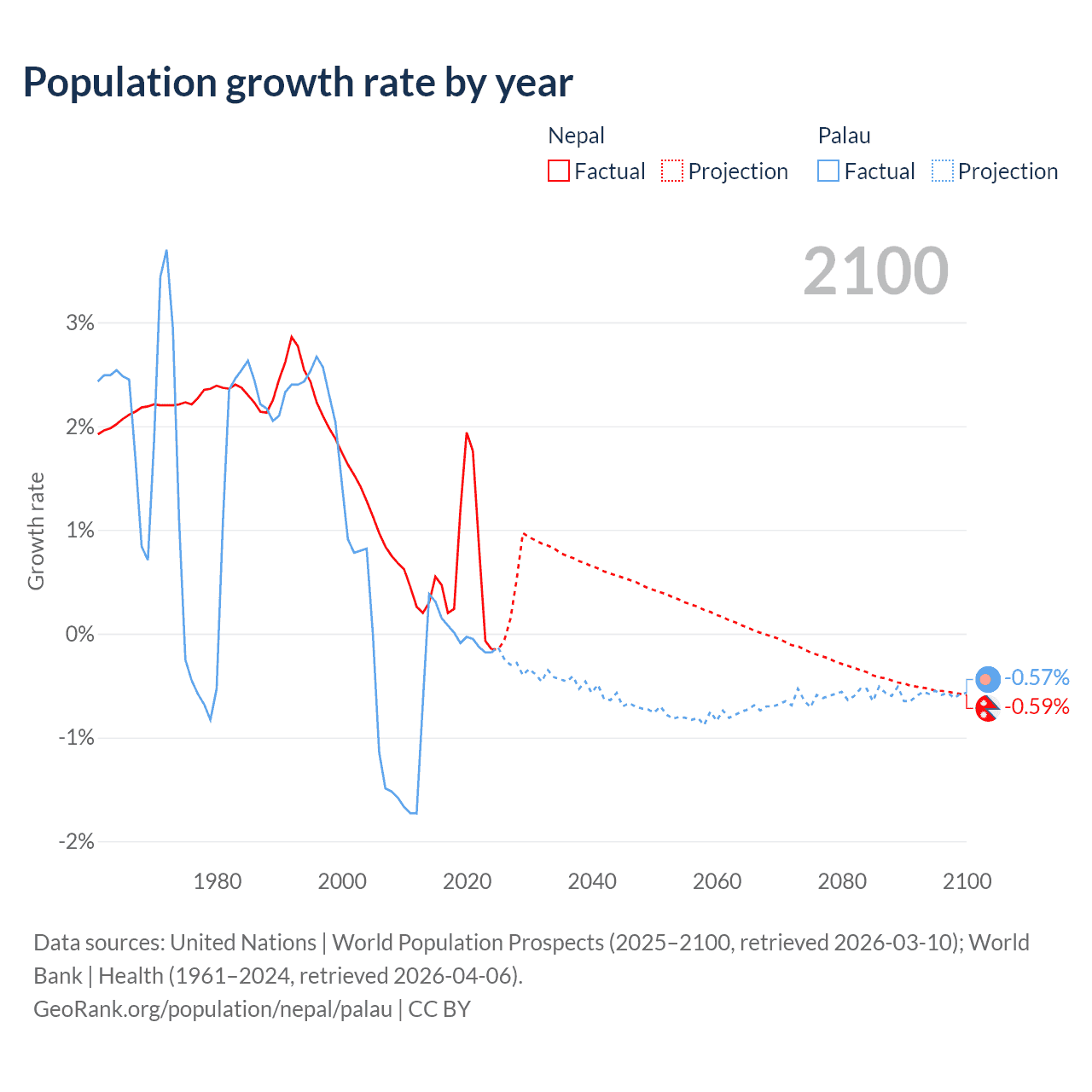 - For the last 10 years, Nepal has had an average growth rate of +0.66% per year vs +0.02% in Palau.