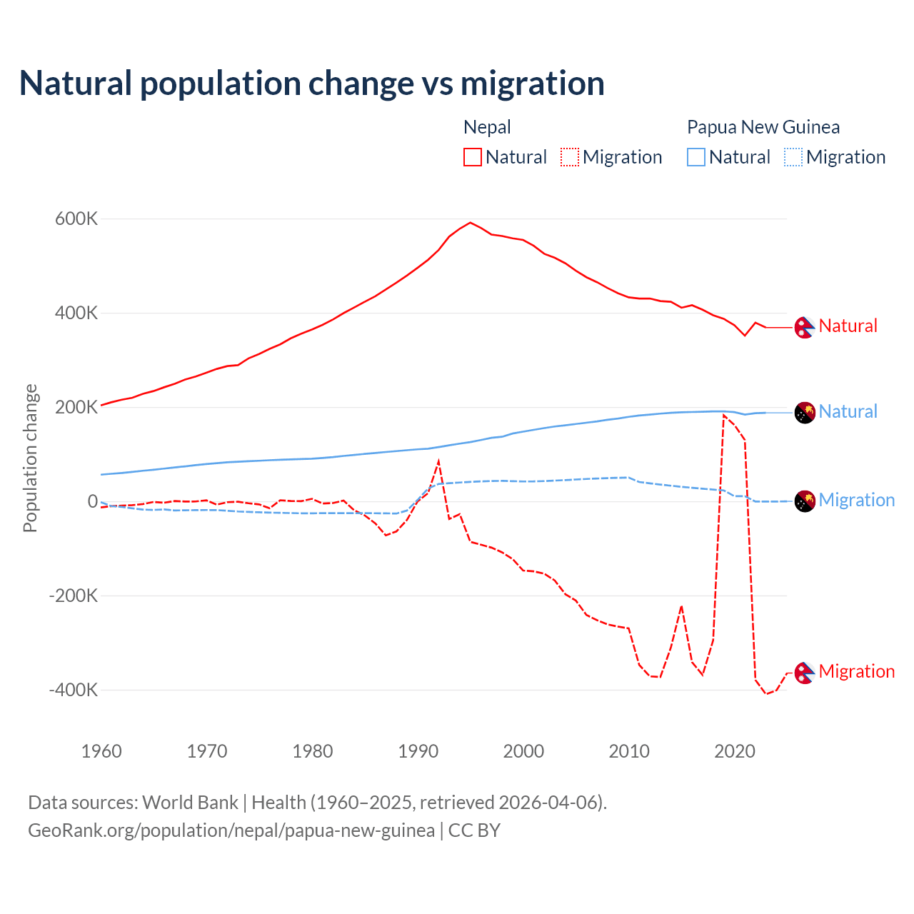 Over the last 10 years, 67.9% of the population change in Nepal is from natural causes (a gain of 3,909,749 people) and 32.1% is from migration (a loss of 1,851,664 people). In Papua New Guinea 91% is from natural causes (a gain of 1,883,906 people) and 8.98% is from migration (a gain of 185,900 people).