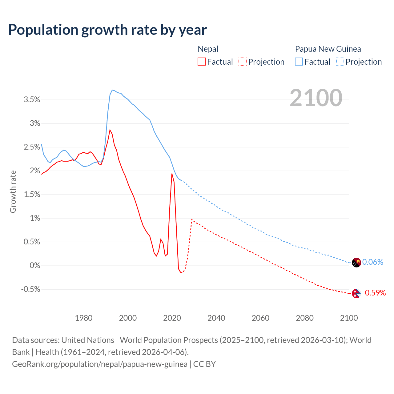 - For the last 10 years, Nepal has had an average growth rate of +0.66% per year vs +2.23% in Papua New Guinea.