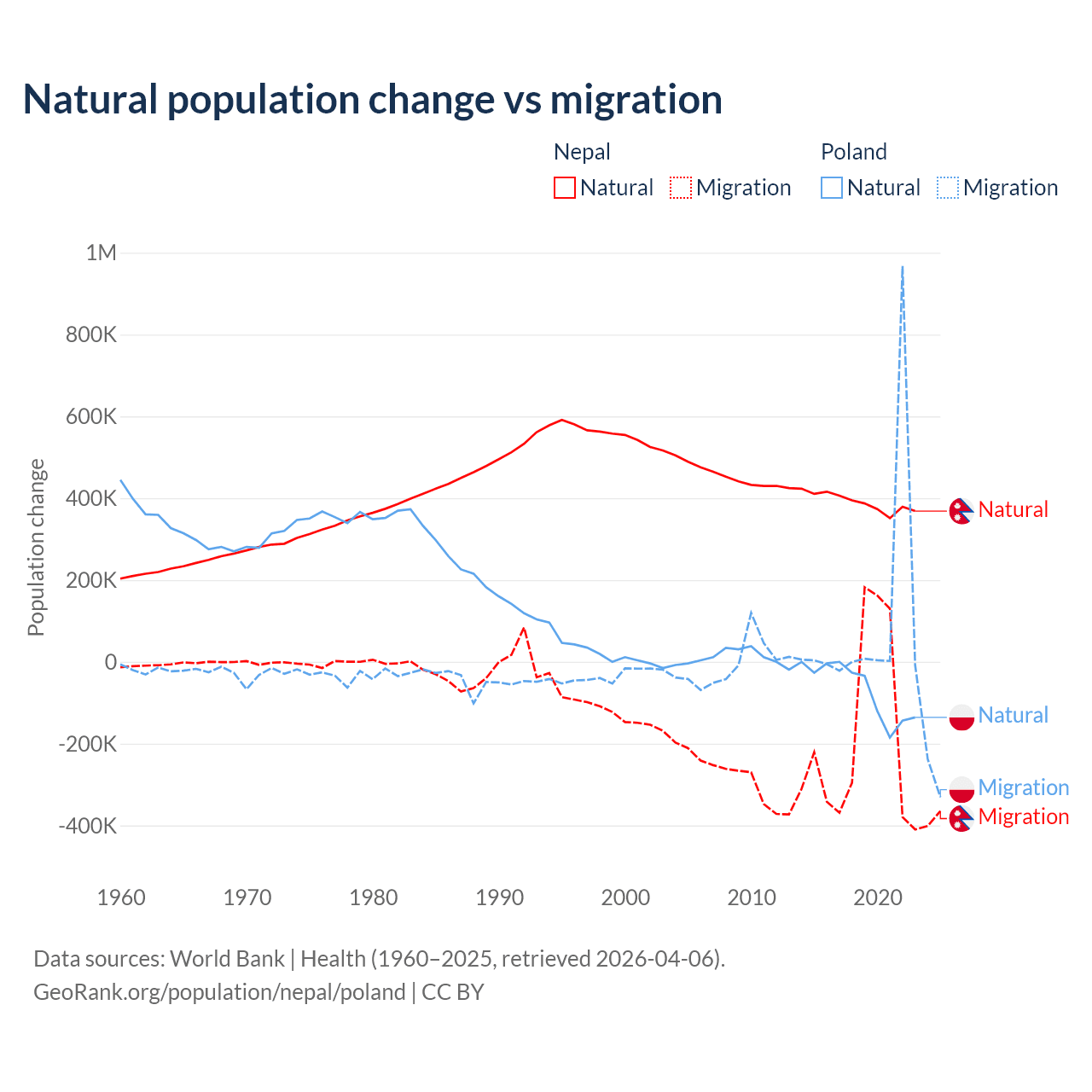 Over the last 10 years, 67.9% of the population change in Nepal is from natural causes (a gain of 3,909,749 people) and 32.1% is from migration (a loss of 1,851,664 people). In Poland 41.4% is from natural causes (a loss of 675,443 people) and 58.6% is from migration (a gain of 955,766 people).