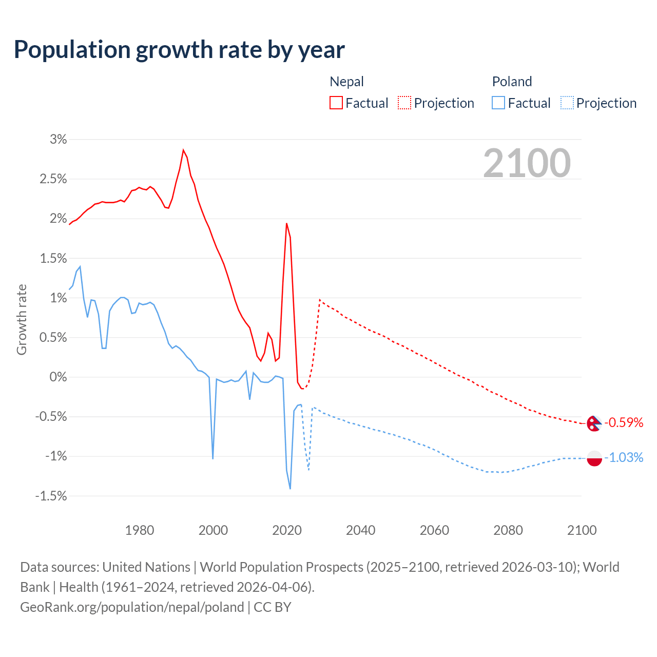 - For the last 10 years, Nepal has had an average growth rate of +0.66% per year vs -0.36% in Poland.