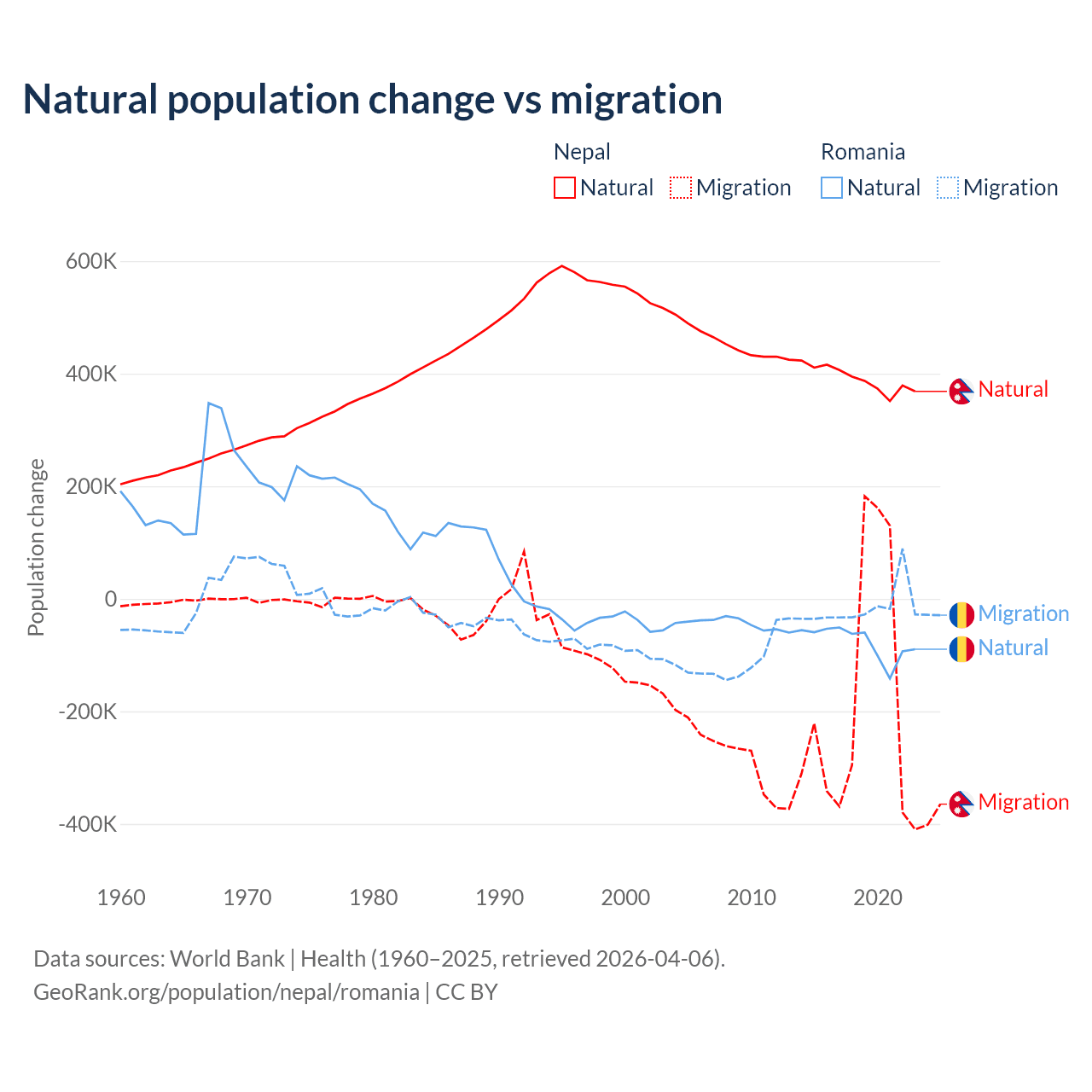 Over the last 10 years, 67.9% of the population change in Nepal is from natural causes (a gain of 3,909,749 people) and 32.1% is from migration (a loss of 1,851,664 people). In Romania 82% is from natural causes (a loss of 766,295 people) and 18% is from migration (a loss of 167,917 people).