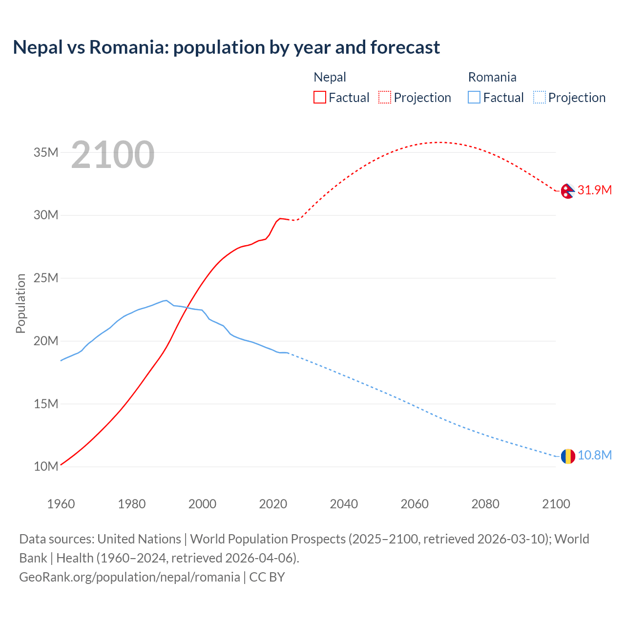 Nepal vs Romania: population by year and forecast