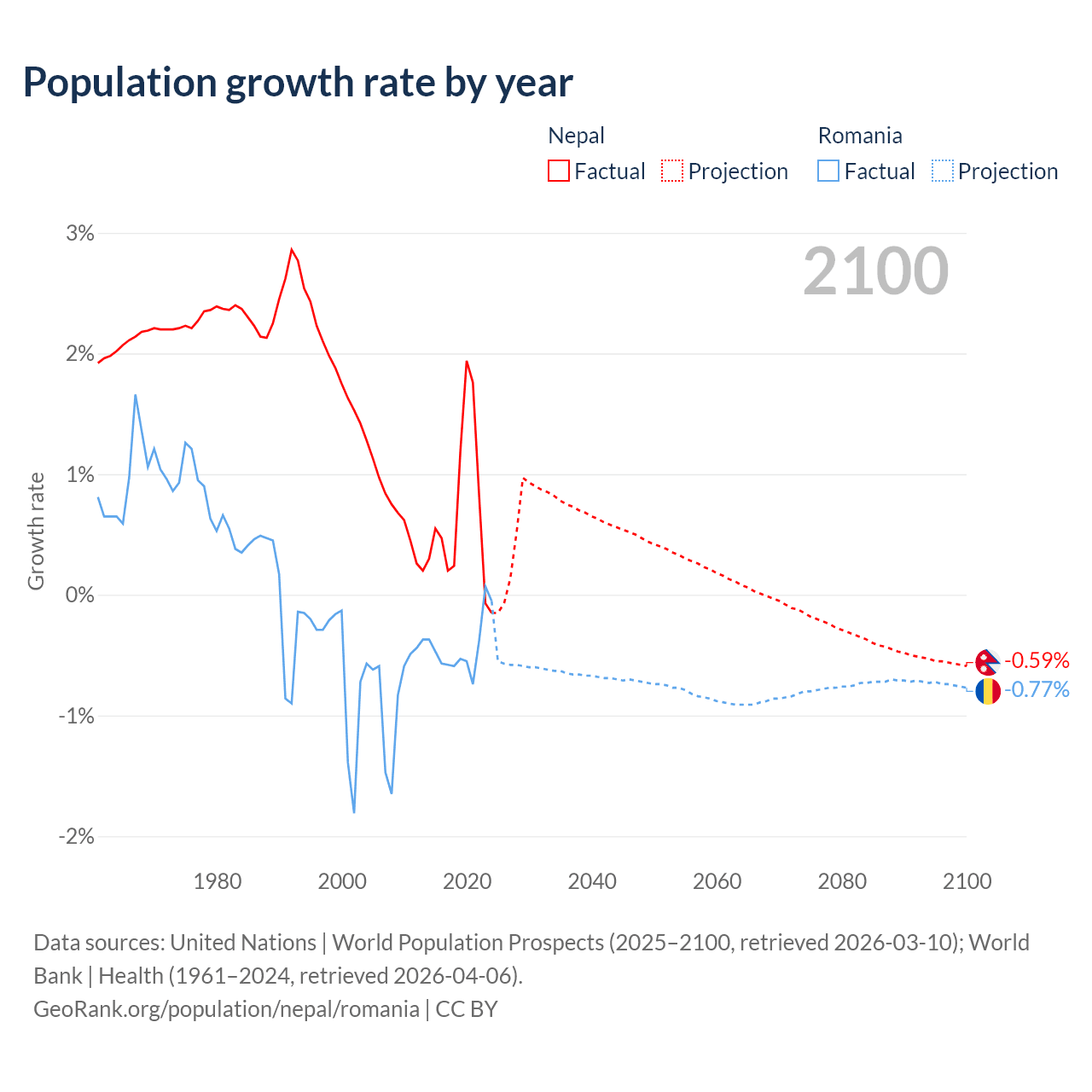 - For the last 10 years, Nepal has had an average growth rate of +0.66% per year vs -0.43% in Romania.