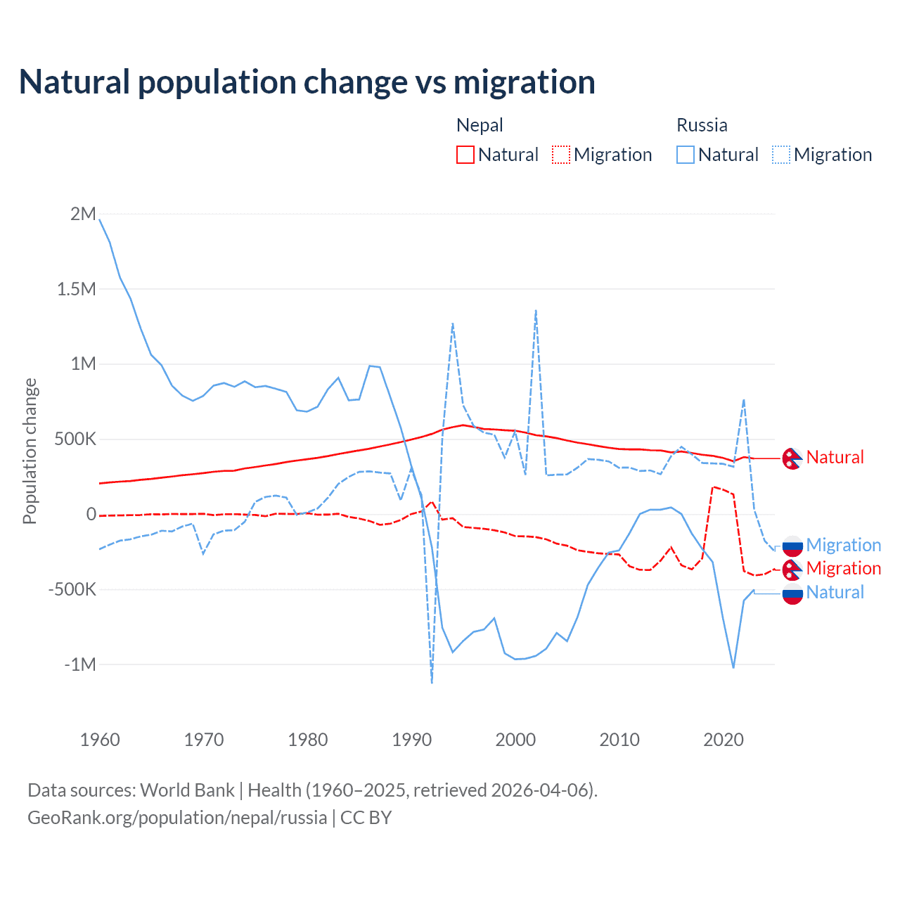 Over the last 10 years, 67.9% of the population change in Nepal is from natural causes (a gain of 3,909,749 people) and 32.1% is from migration (a loss of 1,851,664 people). In Russia 48.6% is from natural causes (a loss of 3,416,377 people) and 51.4% is from migration (a gain of 3,611,826 people).