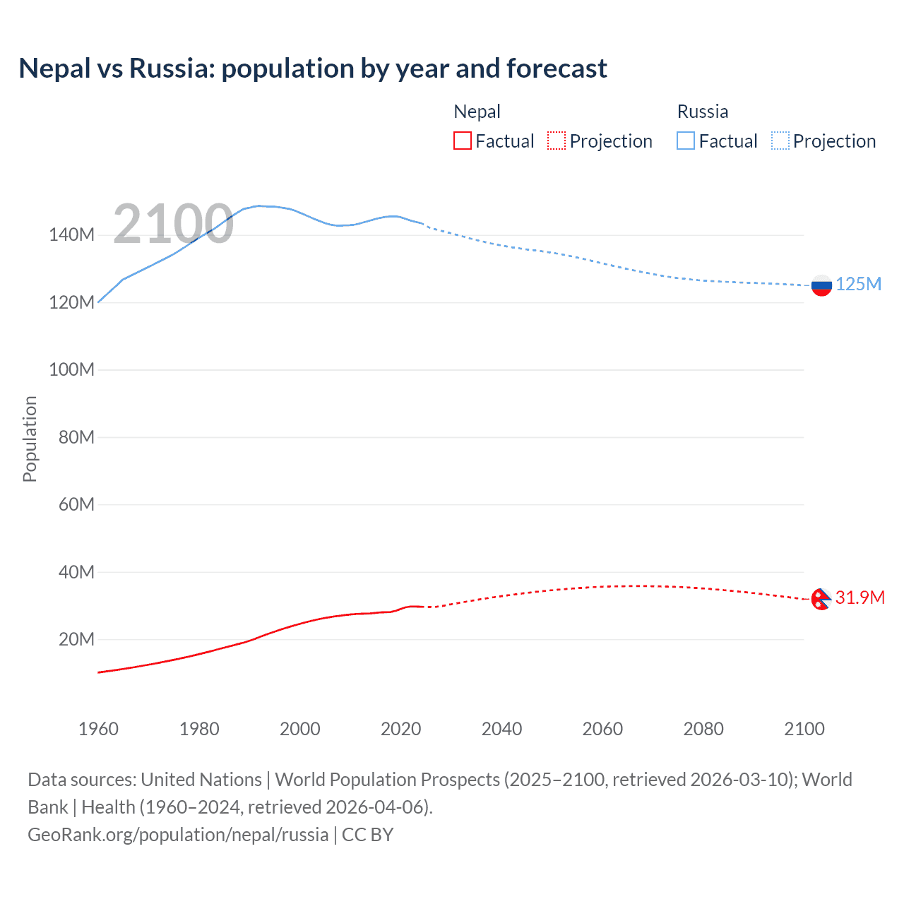 The latest officially reported population of Nepal was 29,651,054 in 2024 vs 143,533,851 people in Russia in 2024. In 2026, based on the adjusted UN estimation, the current Nepal's population is 29,596,762 people compared to 141,906,741 in Russia.
