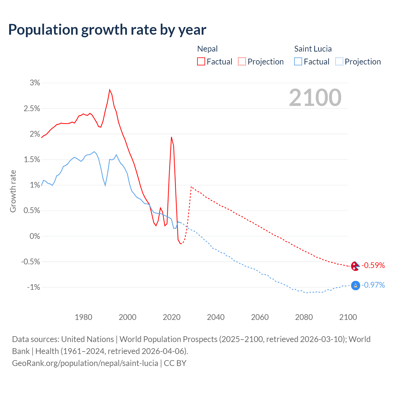 - For the last 10 years, Nepal has had an average growth rate of +0.66% per year vs +0.33% in Saint Lucia.