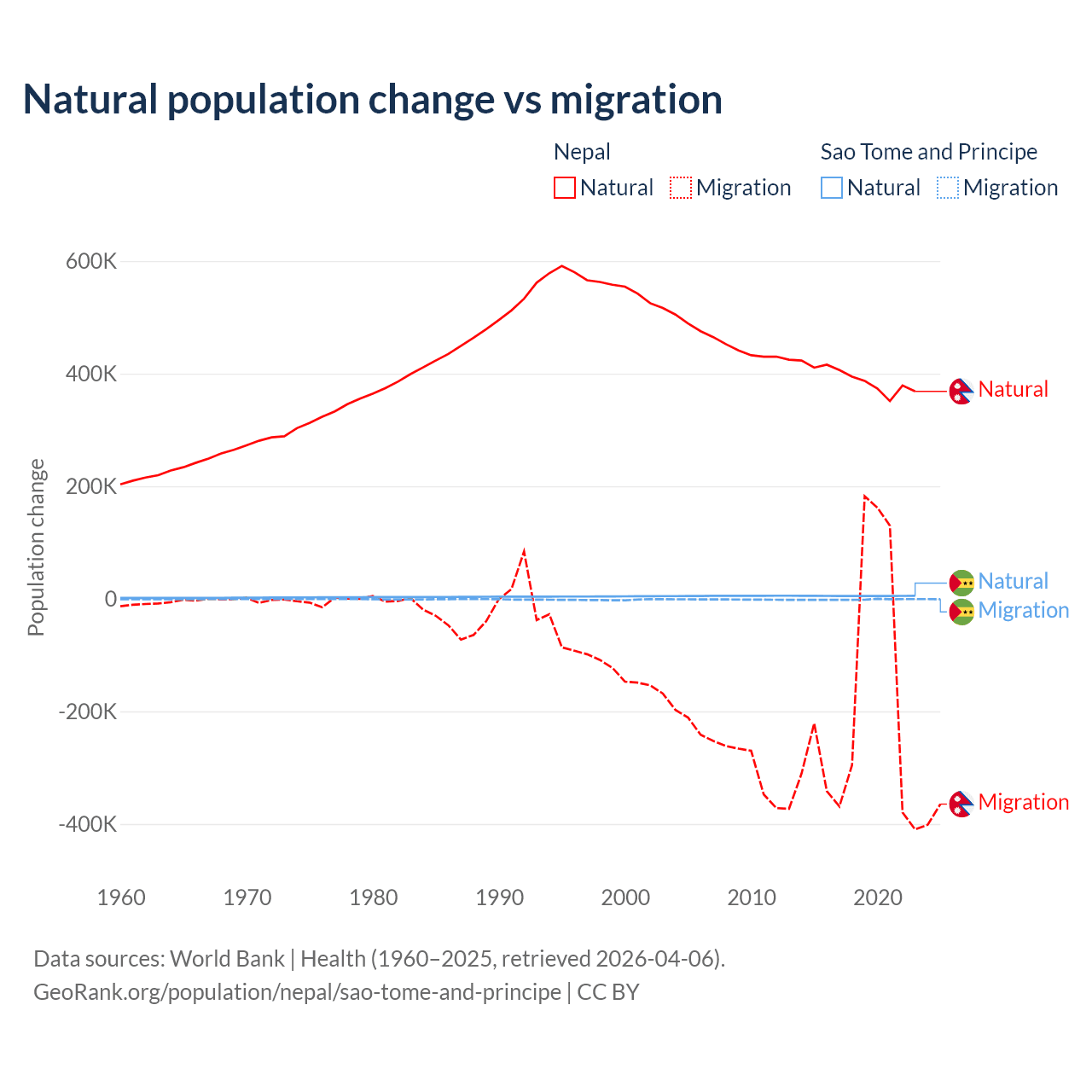 Over the last 10 years, 67.9% of the population change in Nepal is from natural causes (a gain of 3,909,749 people) and 32.1% is from migration (a loss of 1,851,664 people). In Sao Tome and Principe 80.1% is from natural causes (a gain of 50,822 people) and 19.9% is from migration (a loss of 12,621 people).