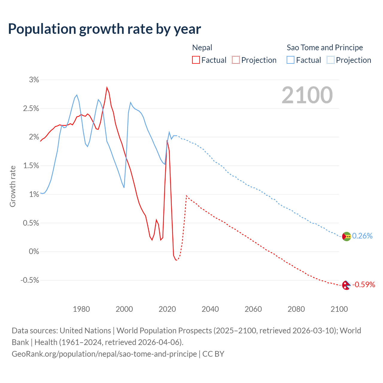 - For the last 10 years, Nepal has had an average growth rate of +0.66% per year vs +1.82% in Sao Tome and Principe.