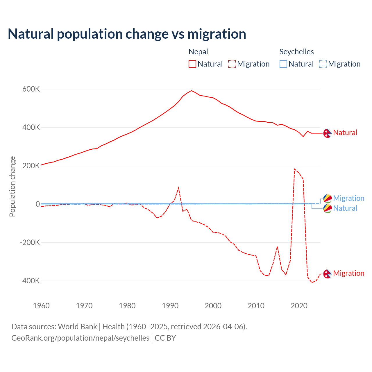 Over the last 10 years, 67.9% of the population change in Nepal is from natural causes (a gain of 3,909,749 people) and 32.1% is from migration (a loss of 1,851,664 people). In the Seychelles 31.4% is from natural causes (a gain of 8,122 people) and 68.6% is from migration (a gain of 17,748 people).