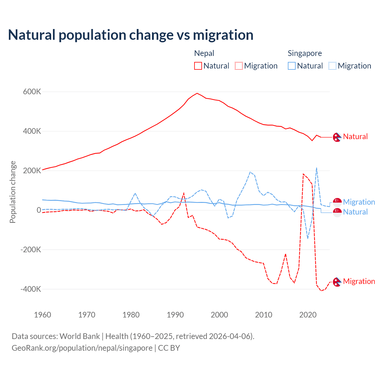 Over the last 10 years, 67.9% of the population change in Nepal is from natural causes (a gain of 3,909,749 people) and 32.1% is from migration (a loss of 1,851,664 people). In Singapore 54.8% is from natural causes (a gain of 195,953 people) and 45.2% is from migration (a gain of 161,805 people).