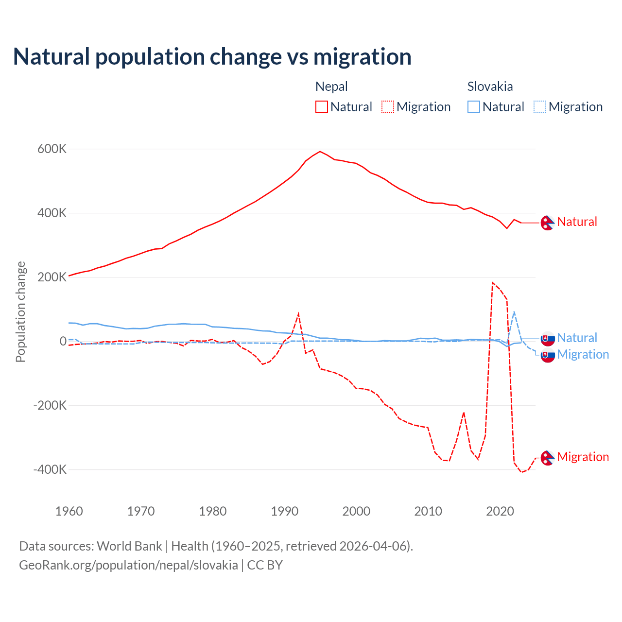 Over the last 10 years, 67.9% of the population change in Nepal is from natural causes (a gain of 3,909,749 people) and 32.1% is from migration (a loss of 1,851,664 people). In Slovakia 7.47% is from natural causes (a loss of 8,728 people) and 92.5% is from migration (a gain of 108,156 people).