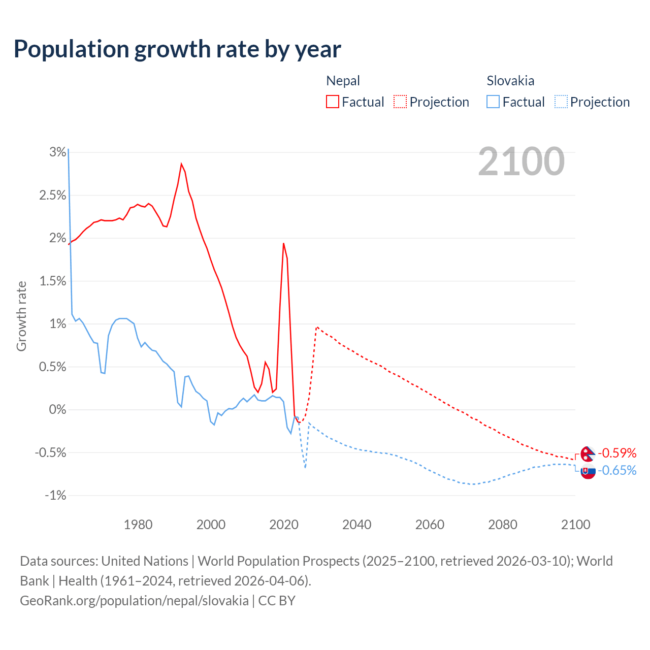 - For the last 10 years, Nepal has had an average growth rate of +0.66% per year vs +0.01% in Slovakia.