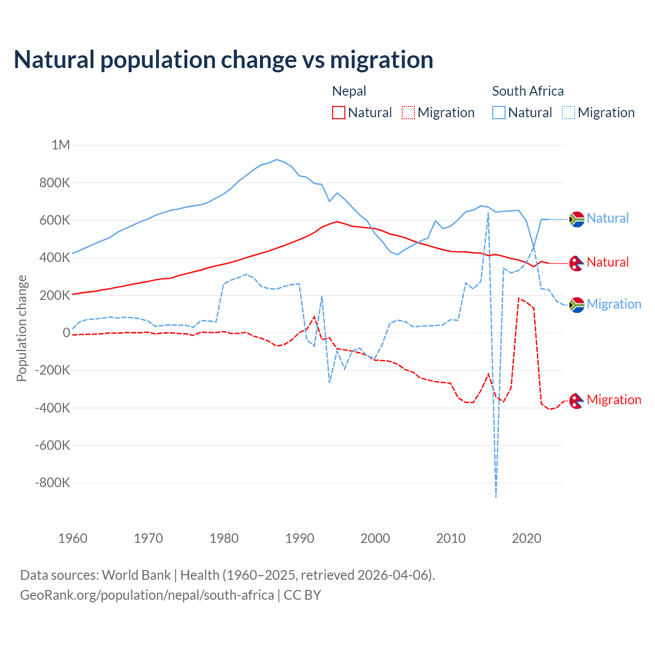 Over the last 10 years, 67.9% of the population change in Nepal is from natural causes (a gain of 3,909,749 people) and 32.1% is from migration (a loss of 1,851,664 people). In South Africa 72.8% is from natural causes (a gain of 6,190,027 people) and 27.2% is from migration (a gain of 2,316,795 people).