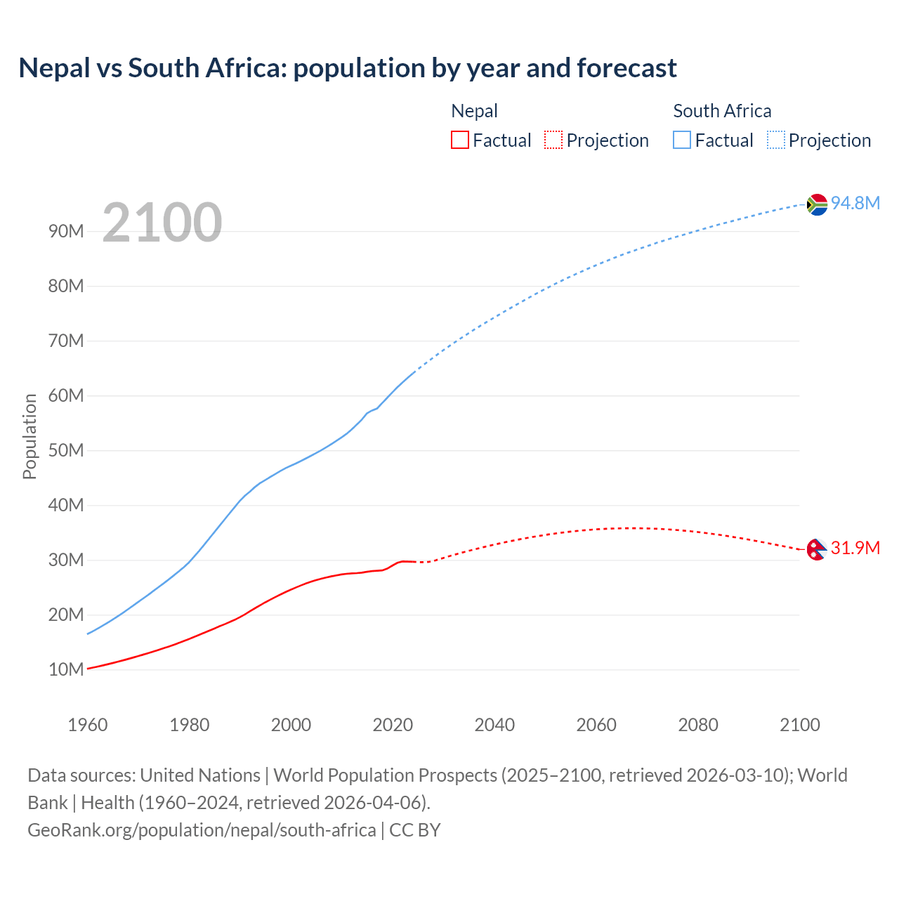 Nepal vs South Africa: population by year and forecast
