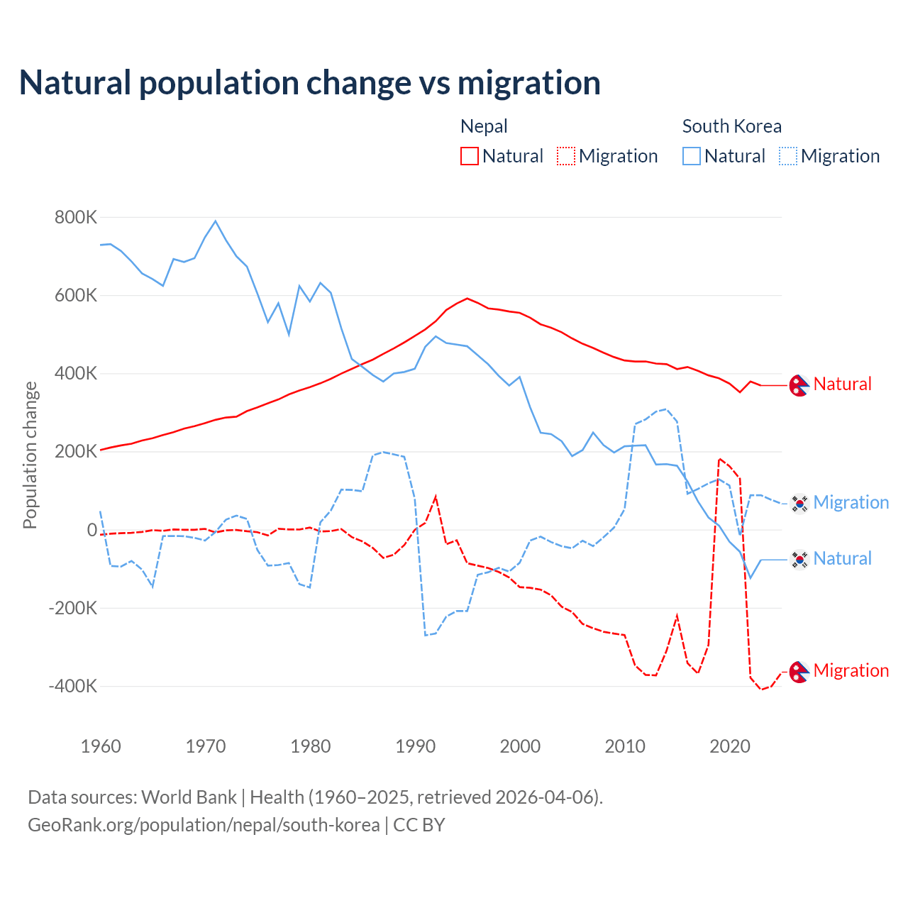Over the last 10 years, 67.9% of the population change in Nepal is from natural causes (a gain of 3,909,749 people) and 32.1% is from migration (a loss of 1,851,664 people). In South Korea 17.6% is from natural causes (a gain of 277,215 people) and 82.4% is from migration (a gain of 1,298,356 people).