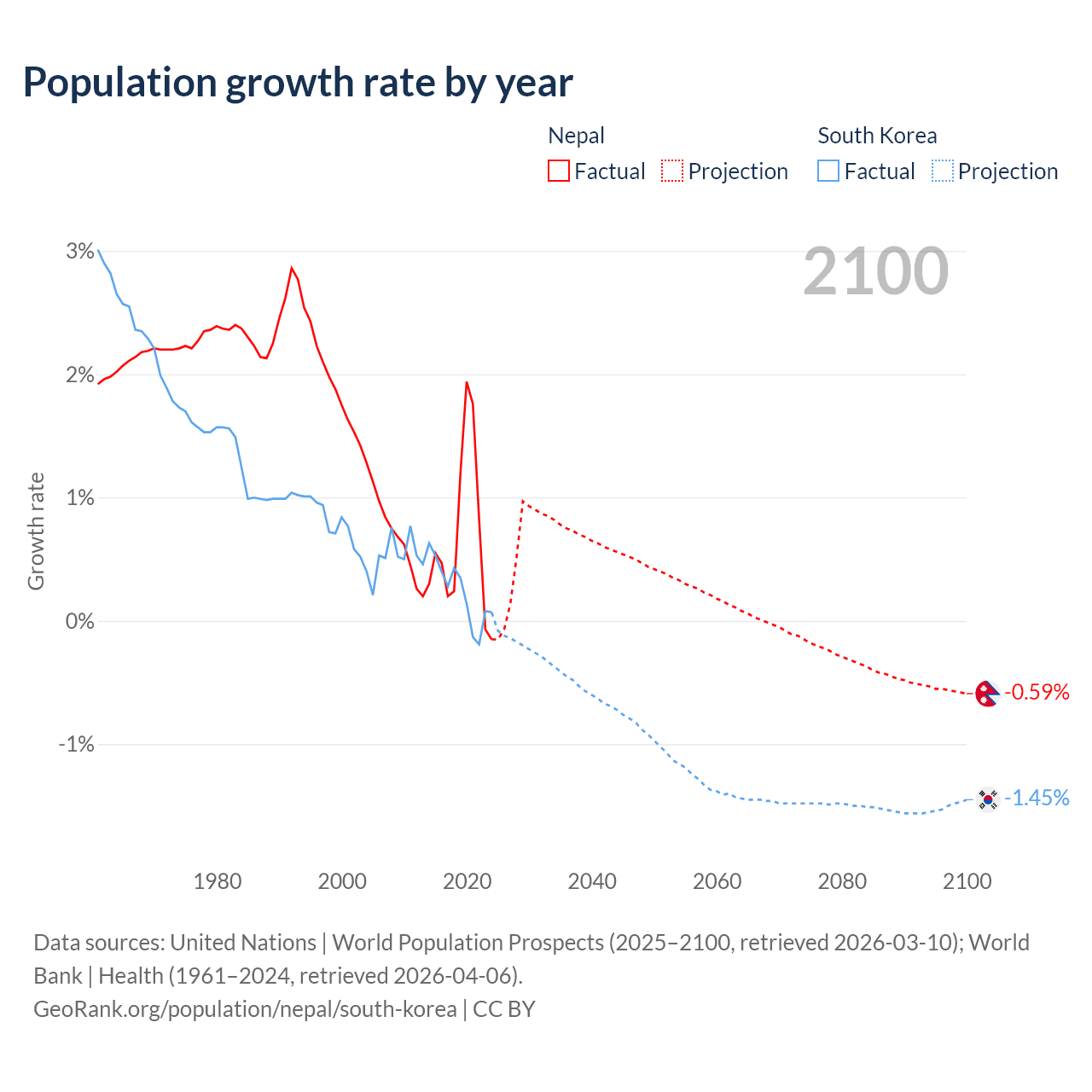 - For the last 10 years, Nepal has had an average growth rate of +0.66% per year vs +0.24% in South Korea.