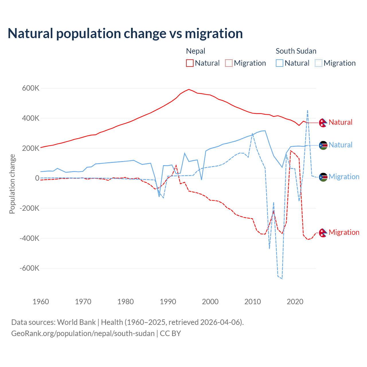 Over the last 10 years, 67.9% of the population change in Nepal is from natural causes (a gain of 3,909,749 people) and 32.1% is from migration (a loss of 1,851,664 people). In South Sudan 57.4% is from natural causes (a gain of 1,792,135 people) and 42.6% is from migration (a loss of 1,329,606 people).