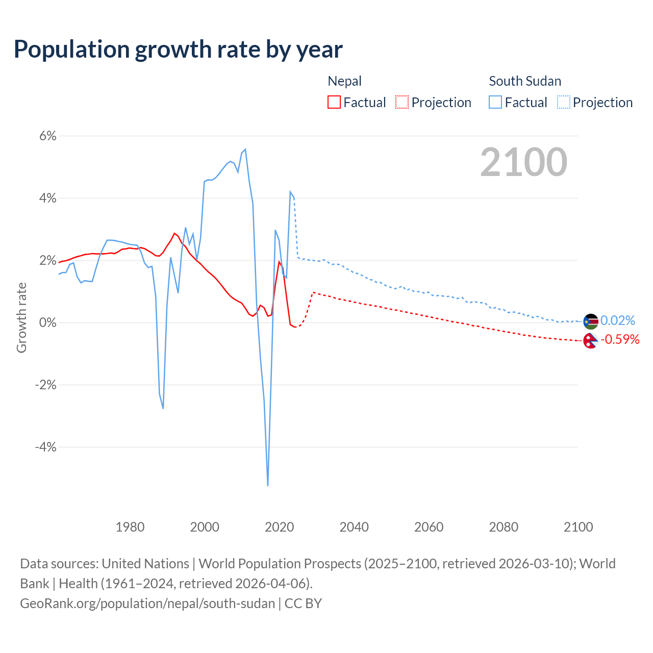 - For the last 10 years, Nepal has had an average growth rate of +0.66% per year vs +0.65% in South Sudan.