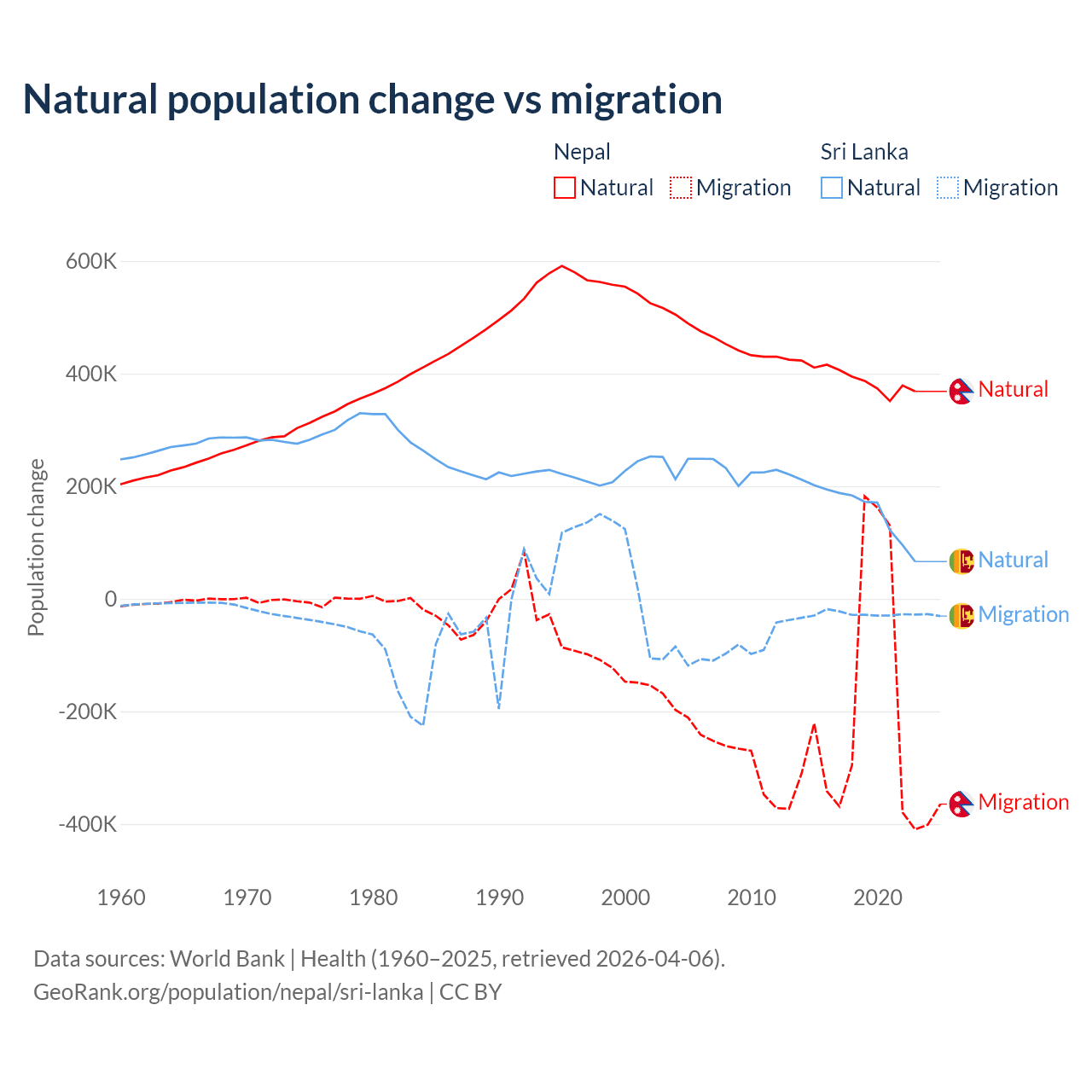 Over the last 10 years, 67.9% of the population change in Nepal is from natural causes (a gain of 3,909,749 people) and 32.1% is from migration (a loss of 1,851,664 people). In Sri Lanka 85.3% is from natural causes (a gain of 1,605,749 people) and 14.7% is from migration (a loss of 276,121 people).